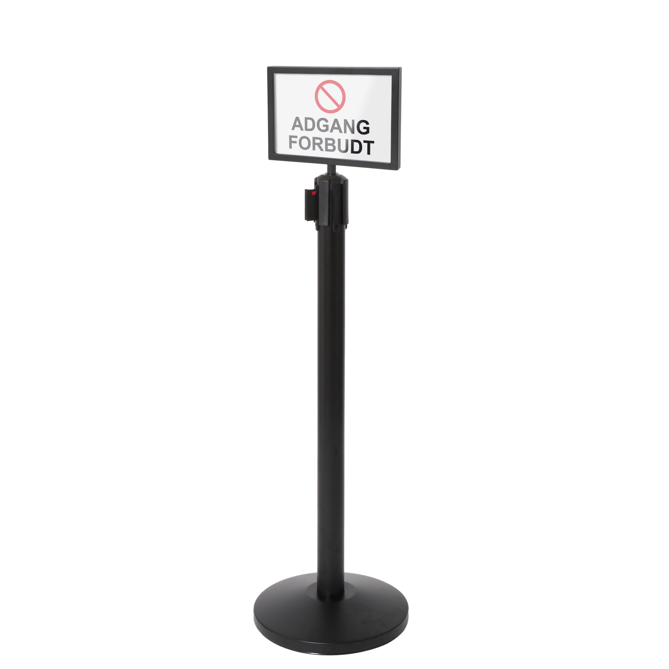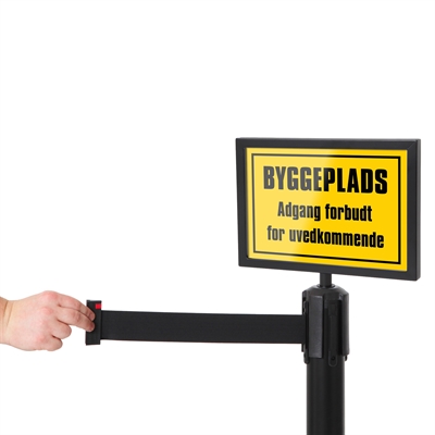 Elegant sort A4 plakatramme i liggende format, laget for montering på avsperringsstolper med bånd. Perfekt for tydelig informasjon, varselskilt eller retningsmerking i avsperrede områder.