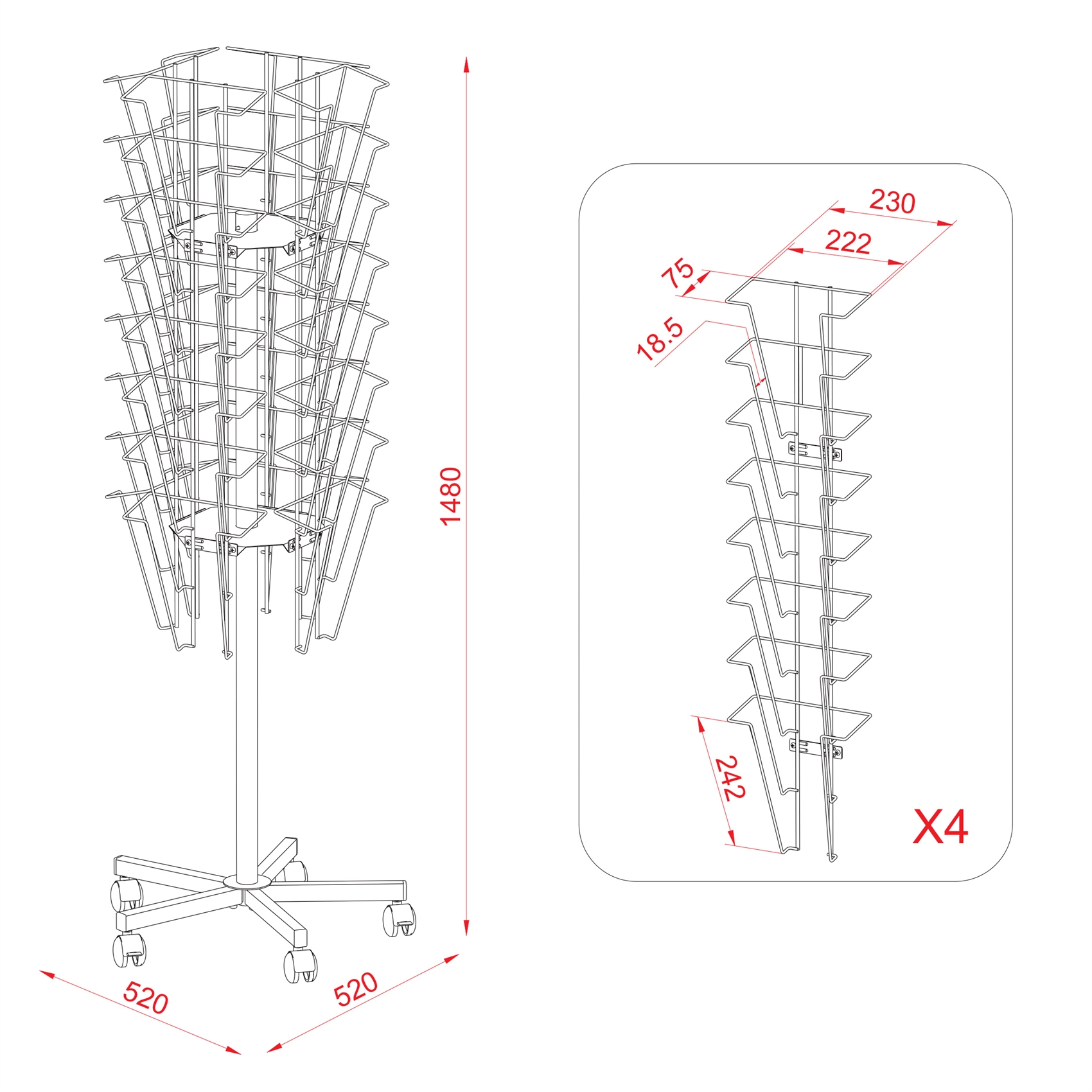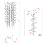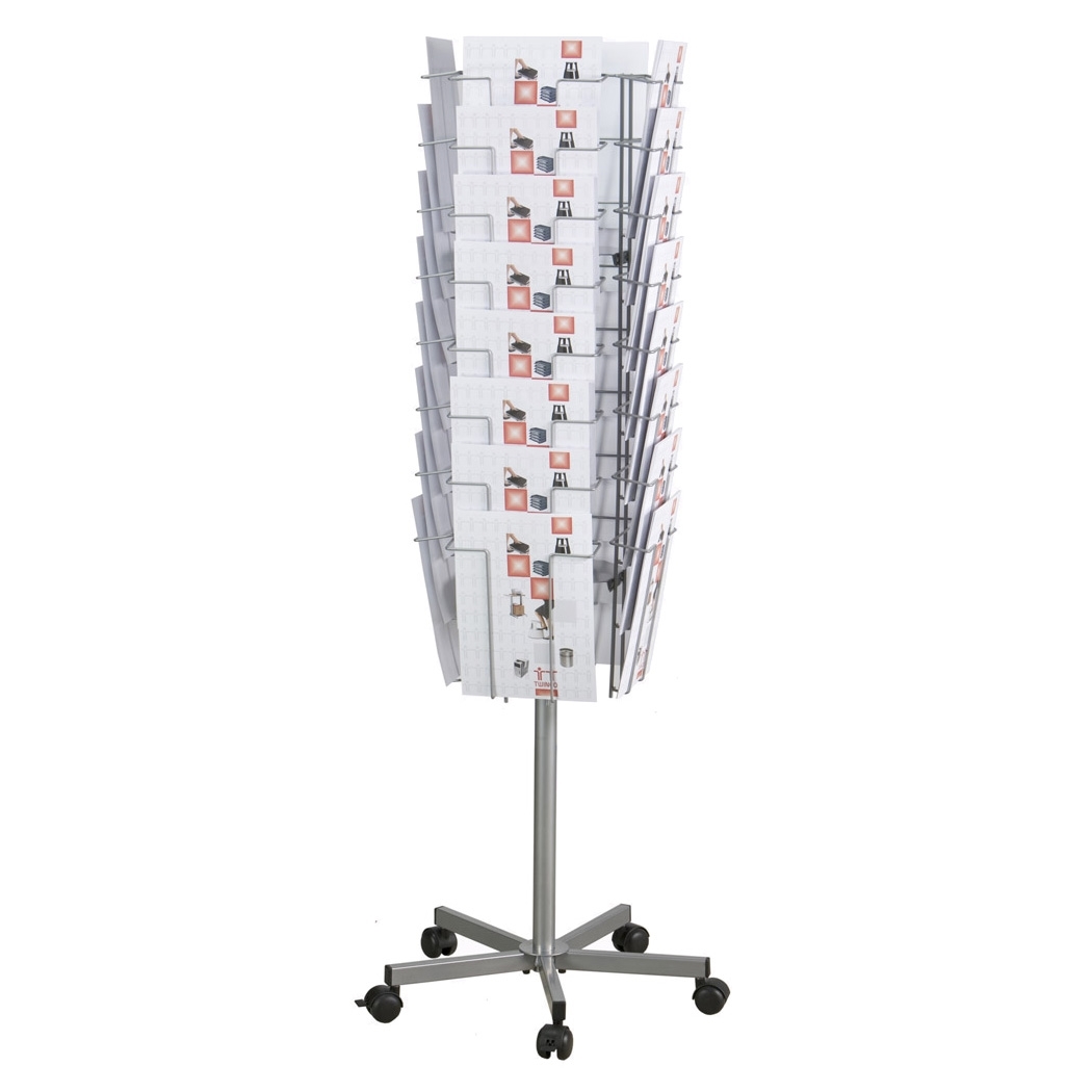 Roterende brosjyrestativ. Leveres med 5 stk. hjul med låsefunksjon. Produsert i tråd.