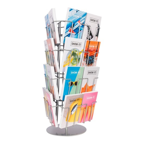 Roterende brosjyrestativ. Plasseres på bord, på disk, messer etc. Produsert i tråd. Polyesterlakkert i RAL9006 sølv.