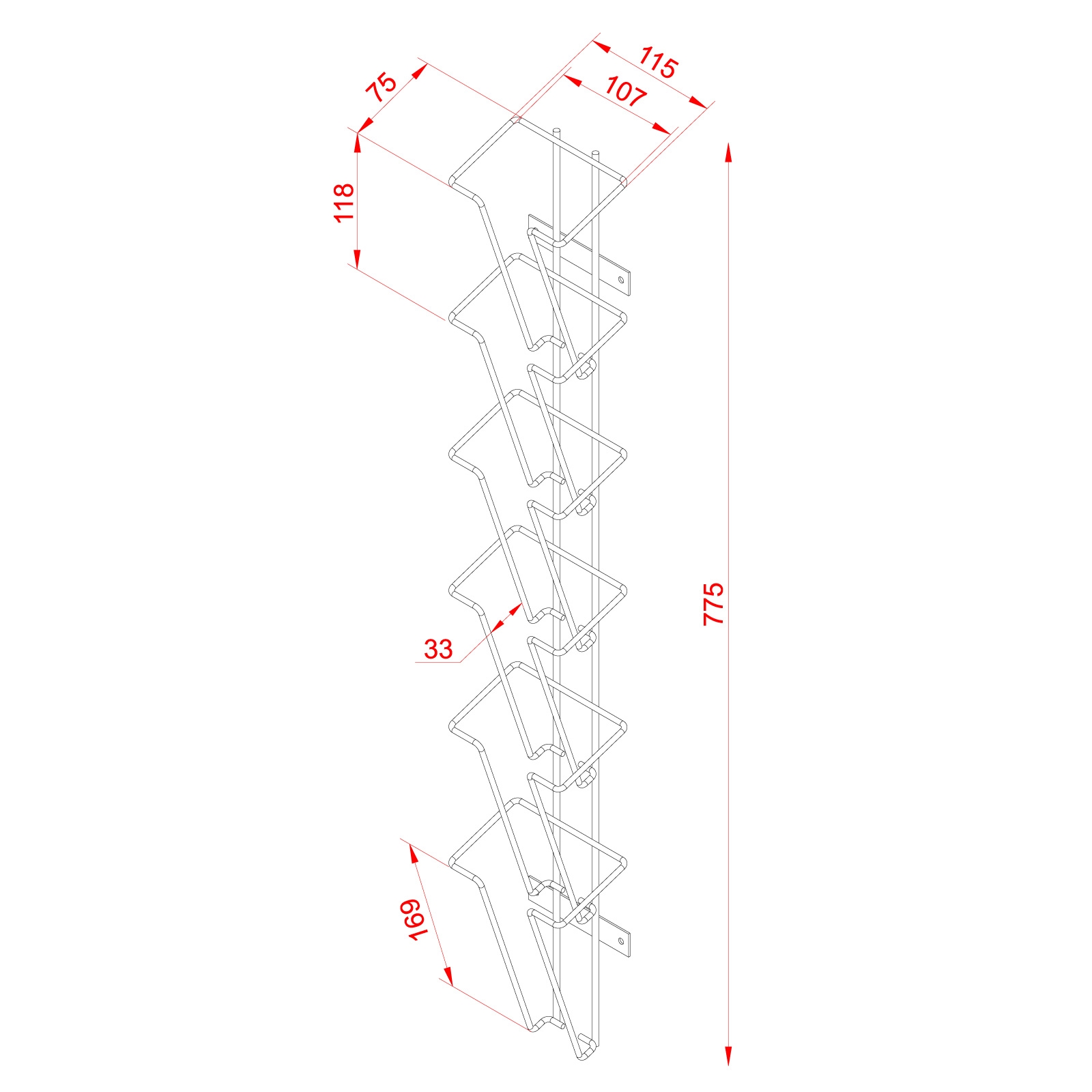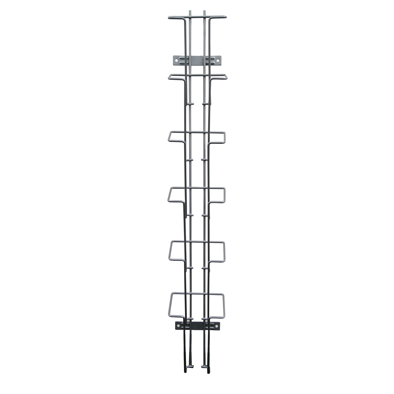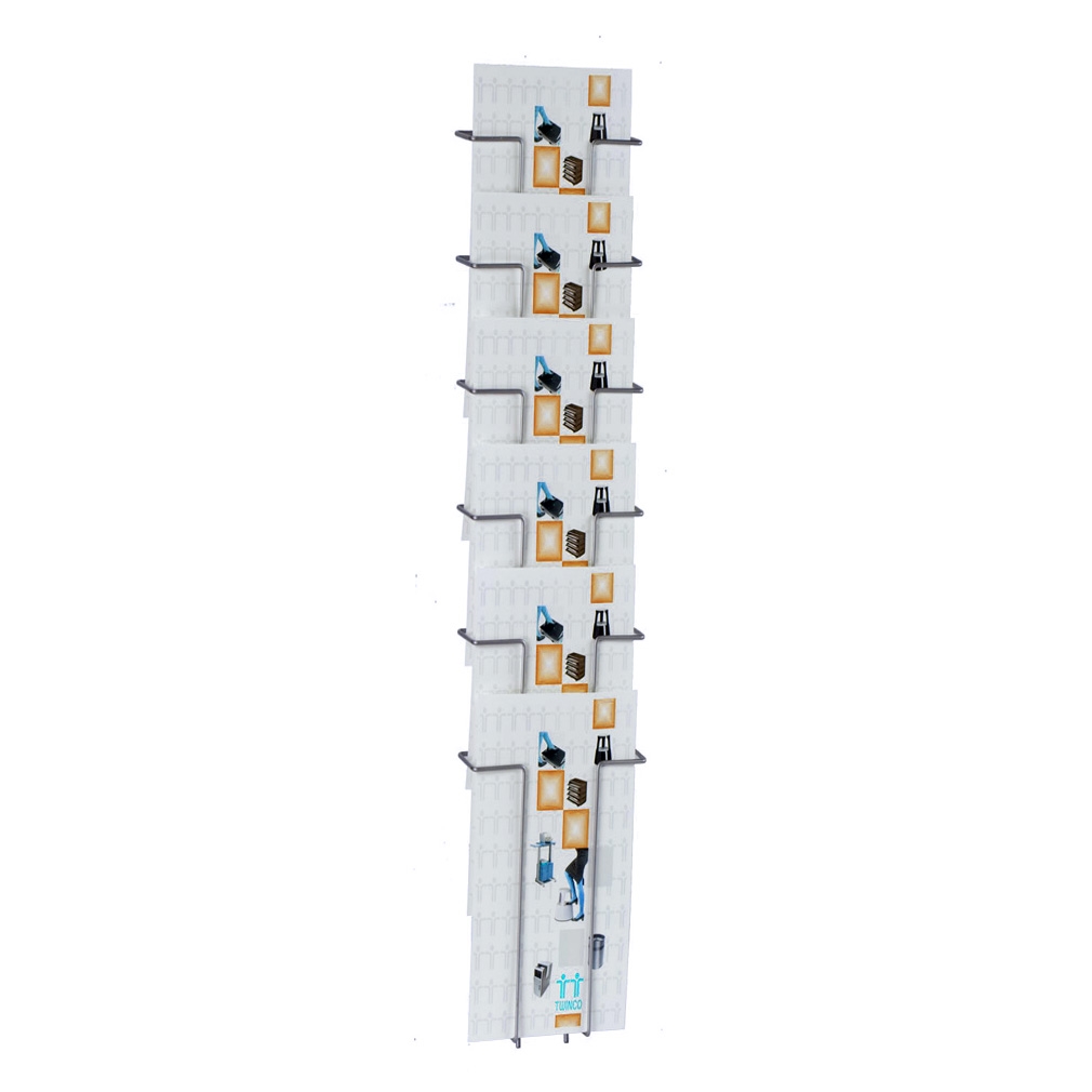 Brosjyreholder med 6 rom for M65-brosjyrer. Produsert i metal. Polyester-lakkert i RAL9006 sølv. For veggmontering.