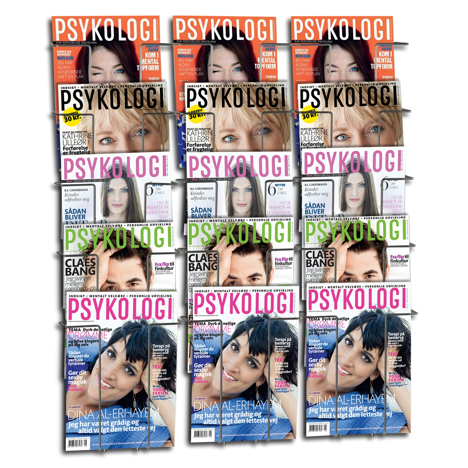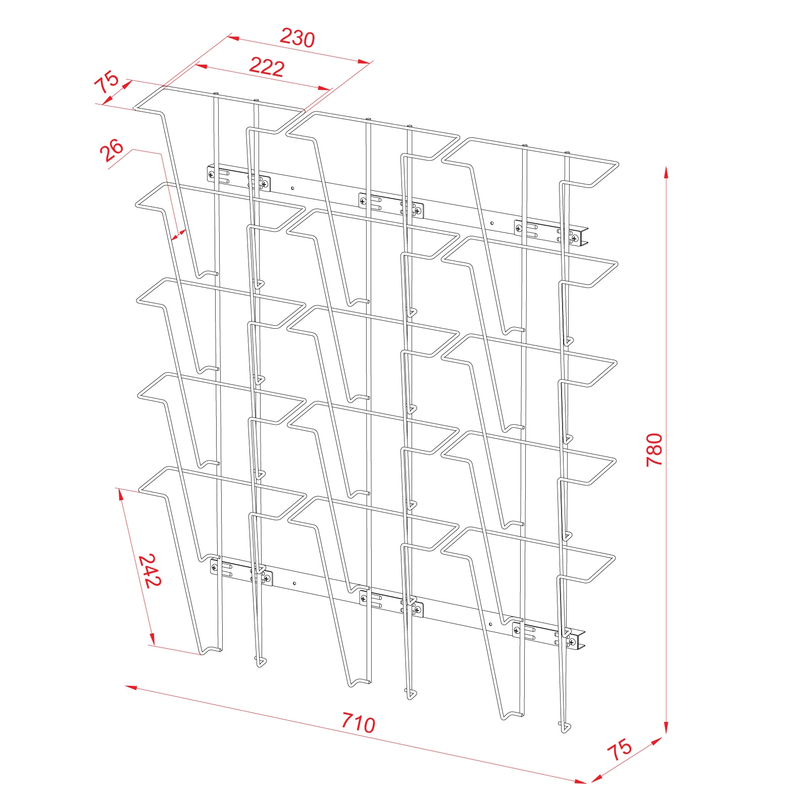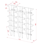 Brosjyreholder med 15 rom for A4-brosjyrer. Produsert i metal. Polyester-lakkert i RAL9006 sølv. For veggmontering.