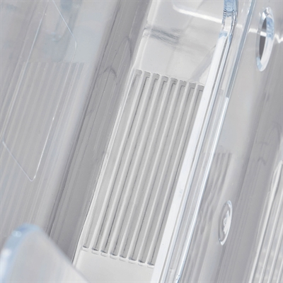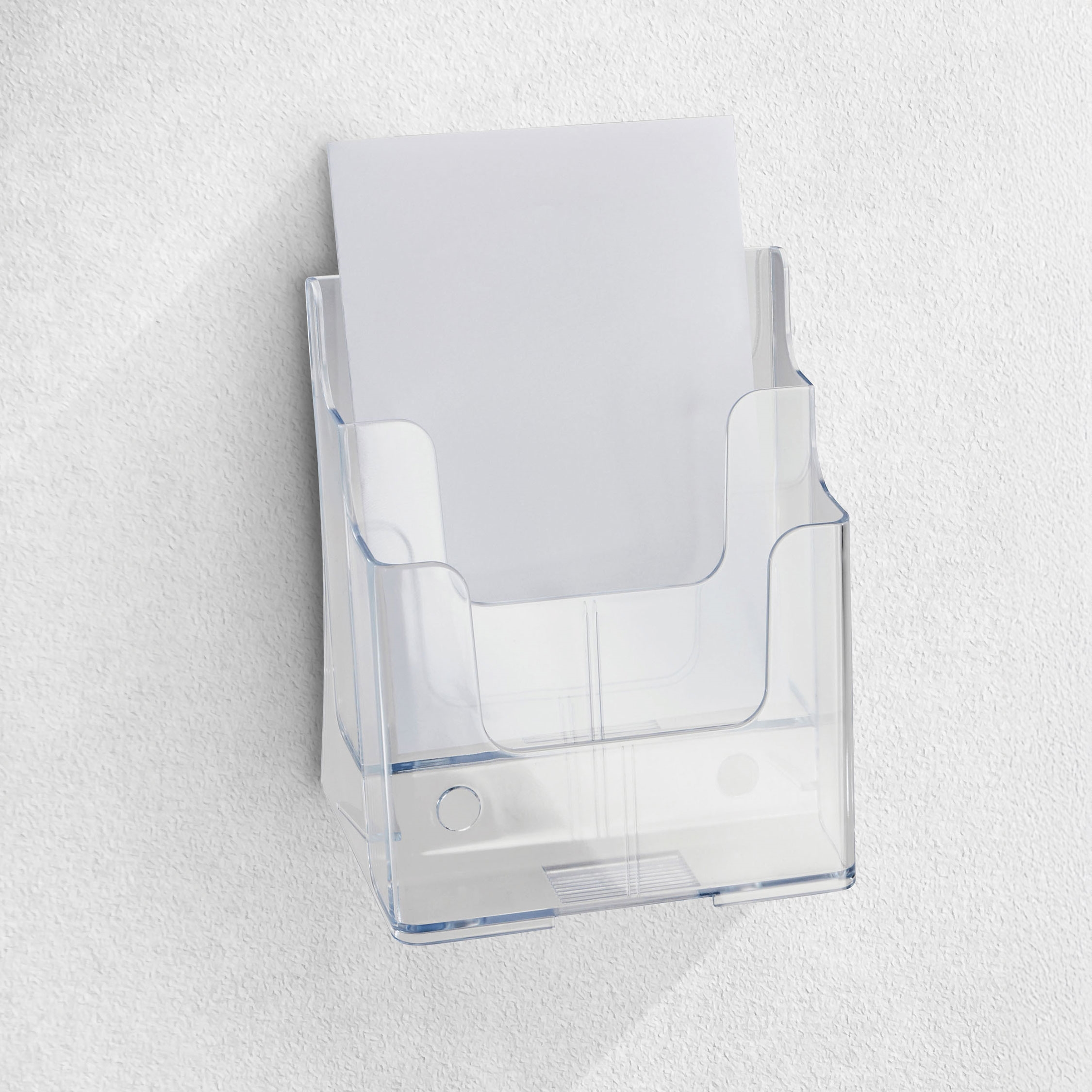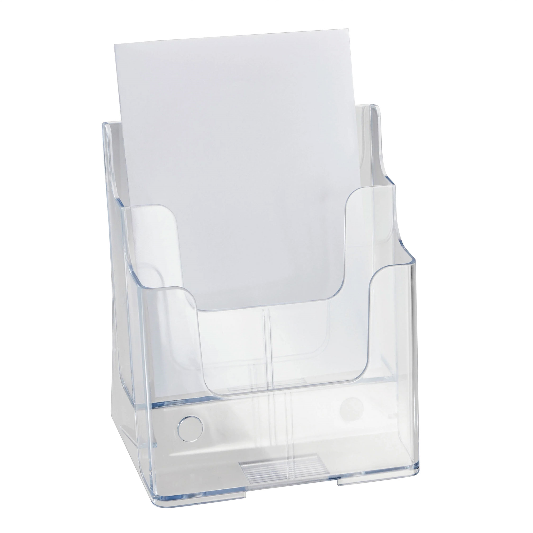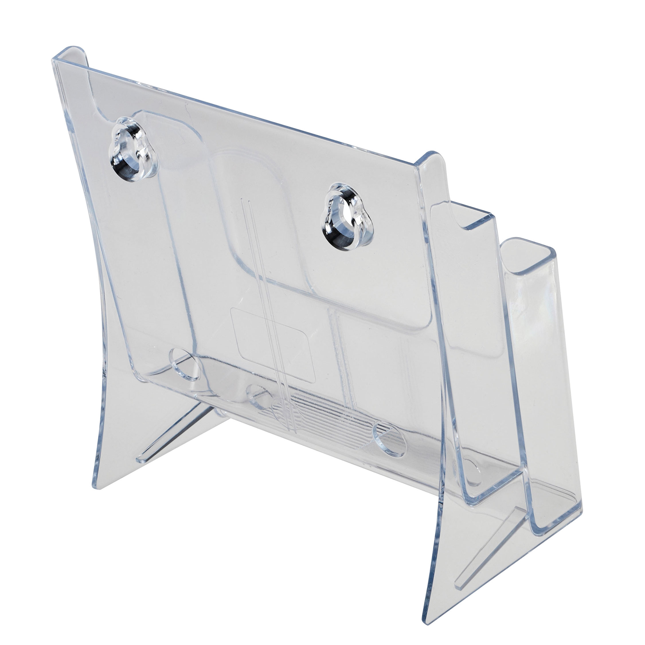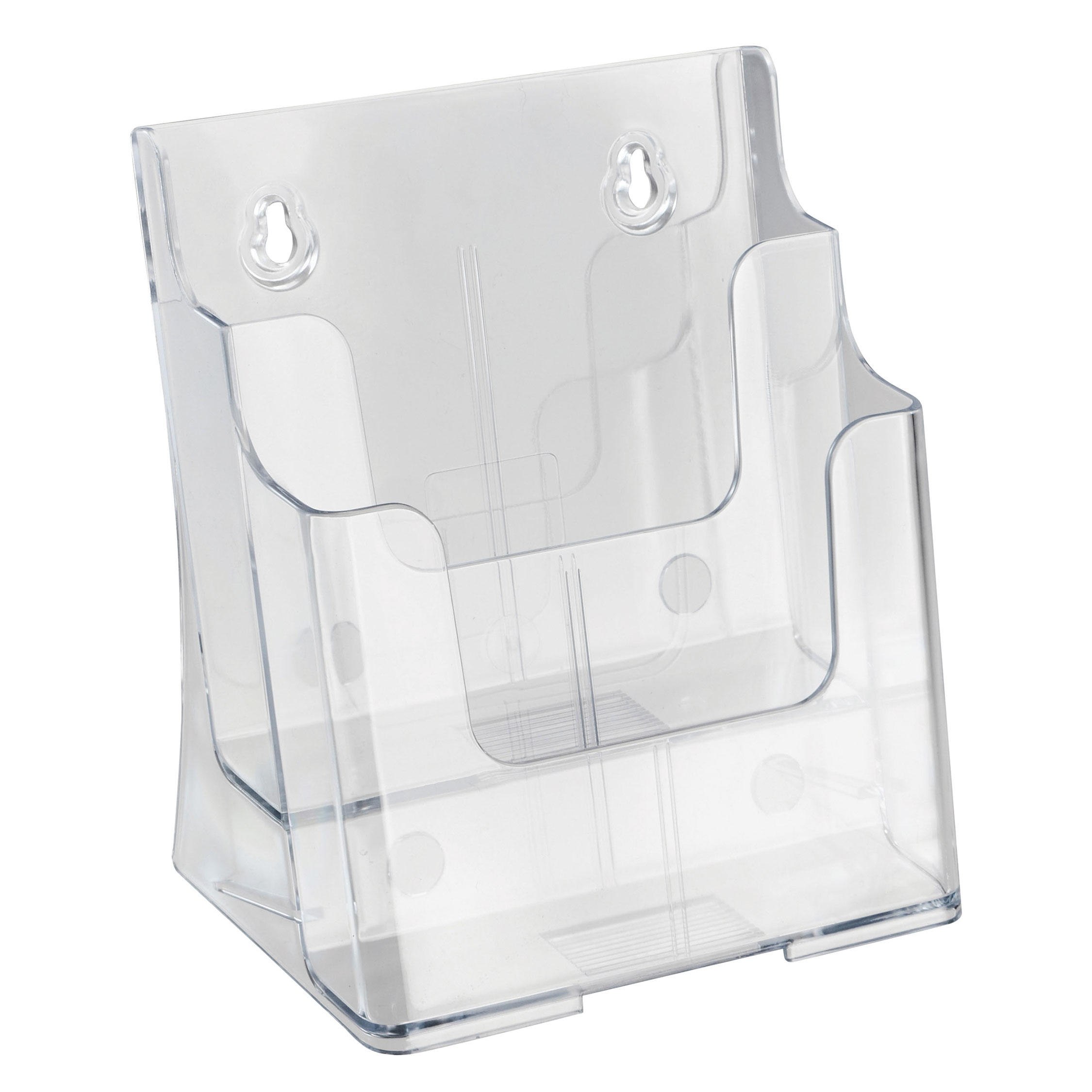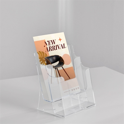 Brosjyreholder i klar akryl med to rom i trappeform. Perfekt for visning av A5-brosjyrer og flyers på bord eller disk. Brosjyrene står lett bakoverlent i ulike høyder for god synlighet og enkel tilgang. Holderen kan enten stå fritt eller festes på vegg med skruehull på baksiden.