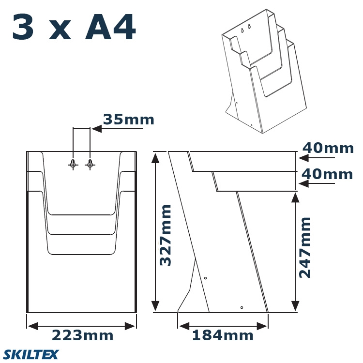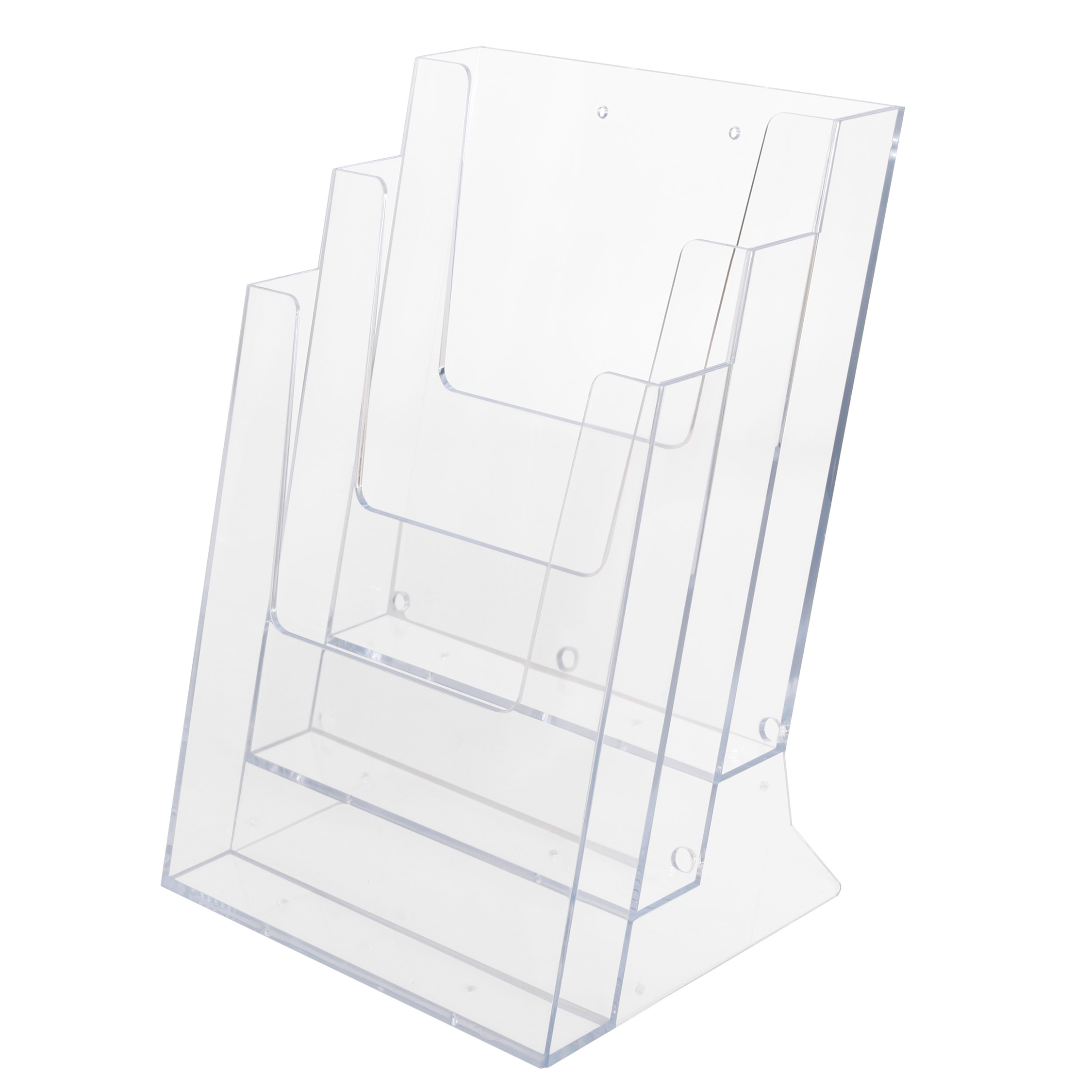 Disse høyformats 3-roms brosjyreholdere er egnet for å stå på bord, benker etc. og er vinklet litt bakover slik at brosjyrene sitter pent i holderen og enkelt kan ses fra øyehøyde.