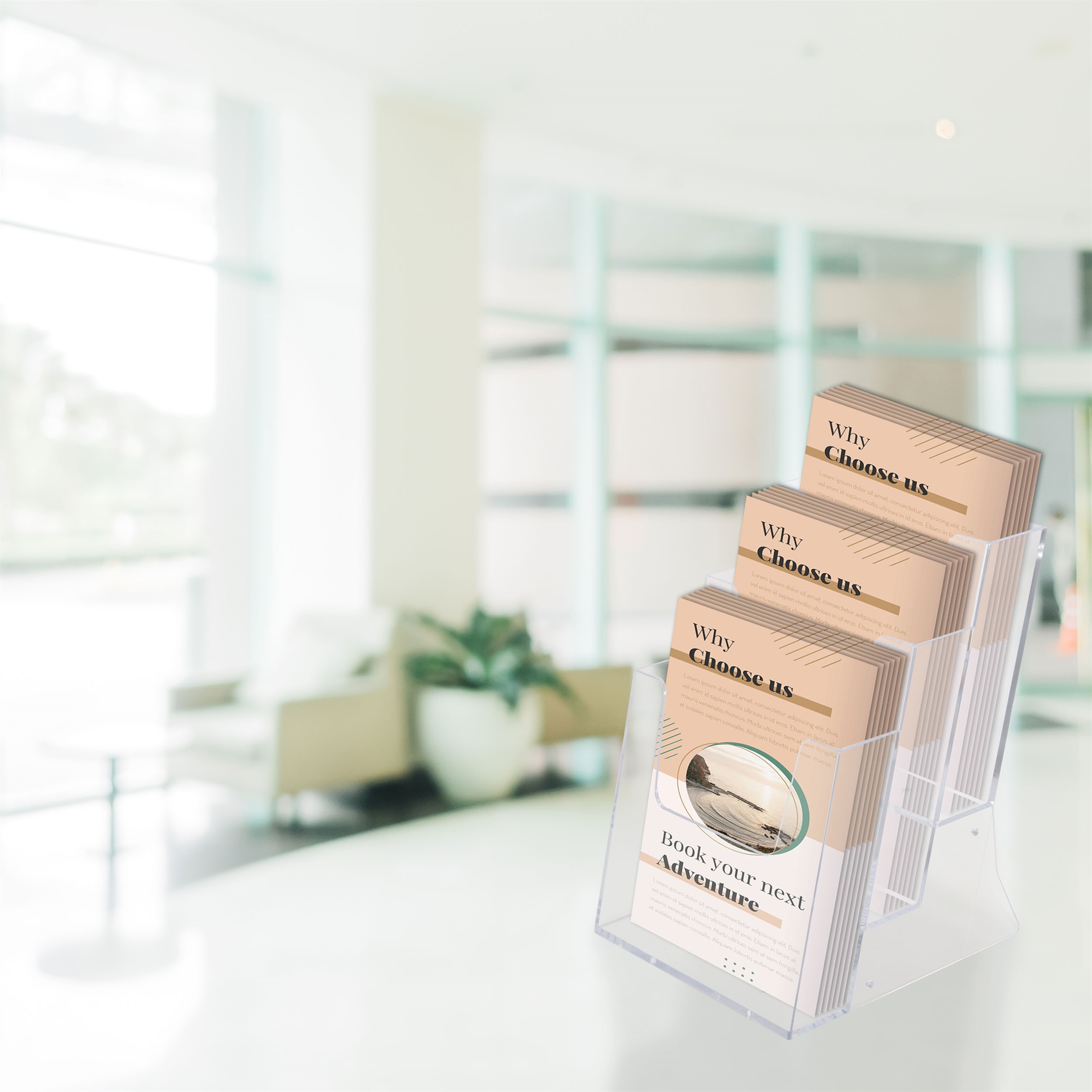 En 3-roms brosjyreholder er den perfekte måten å presentere brosjyrene dine på en ryddig og oversiktlig måte, samtidig som du maksimerer synlighet.