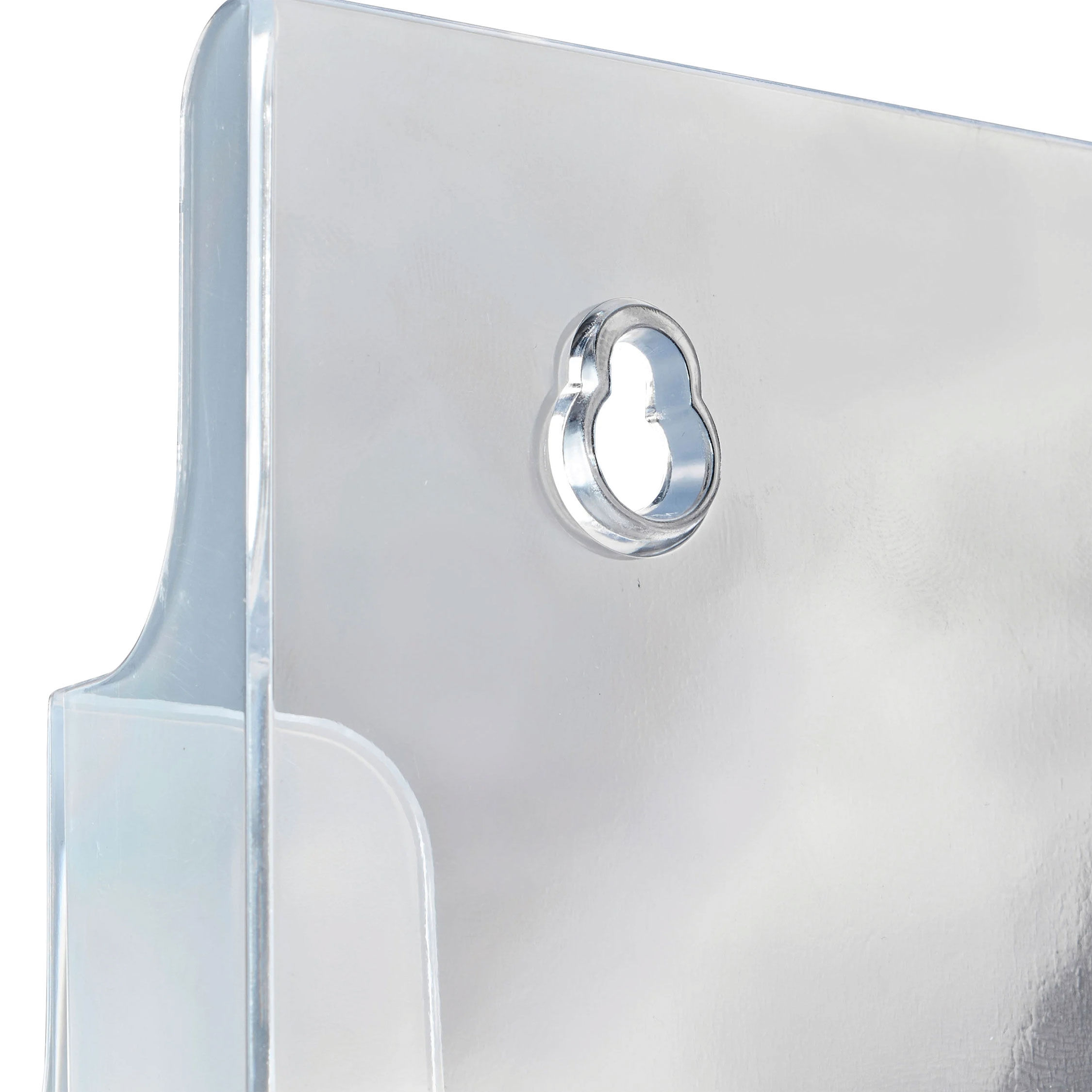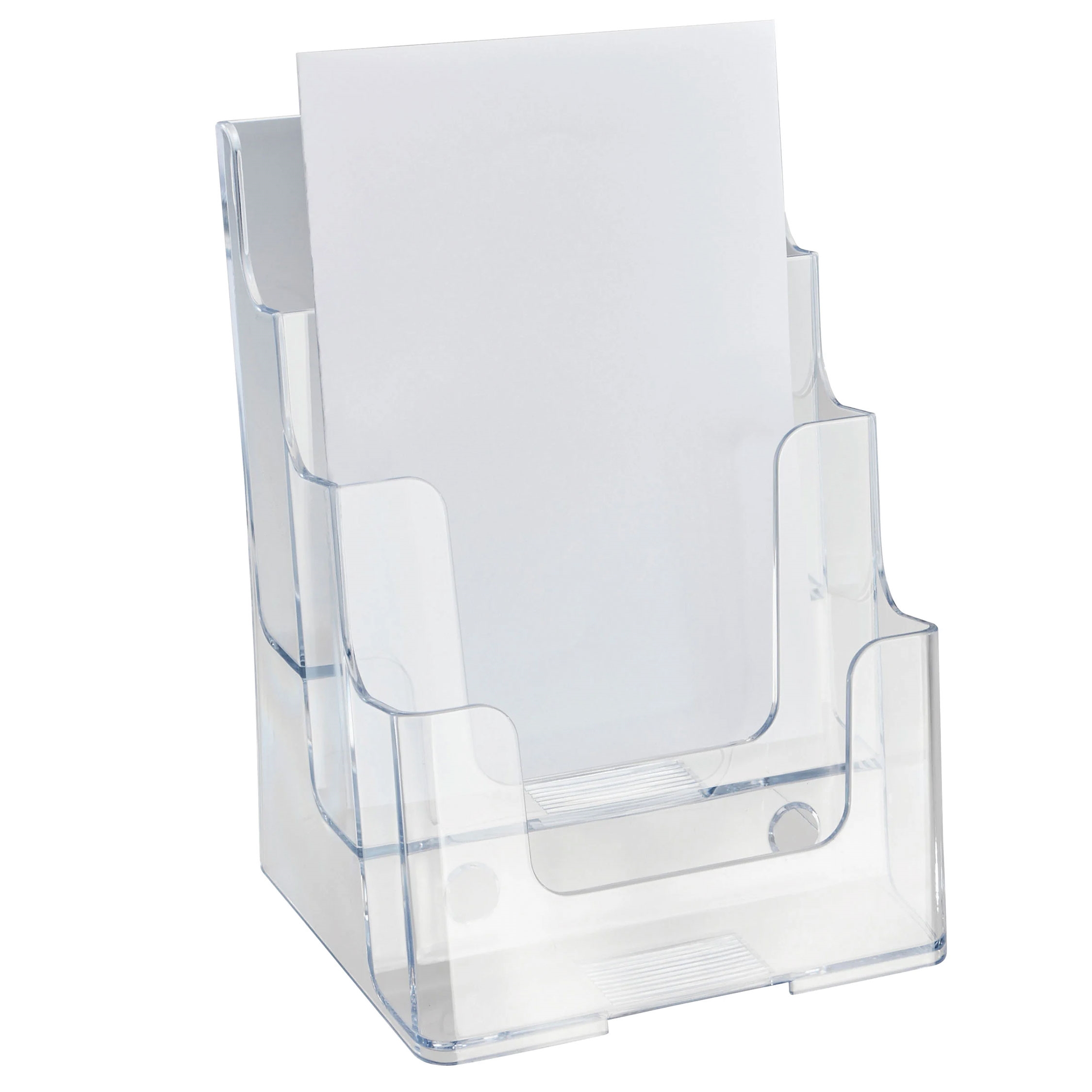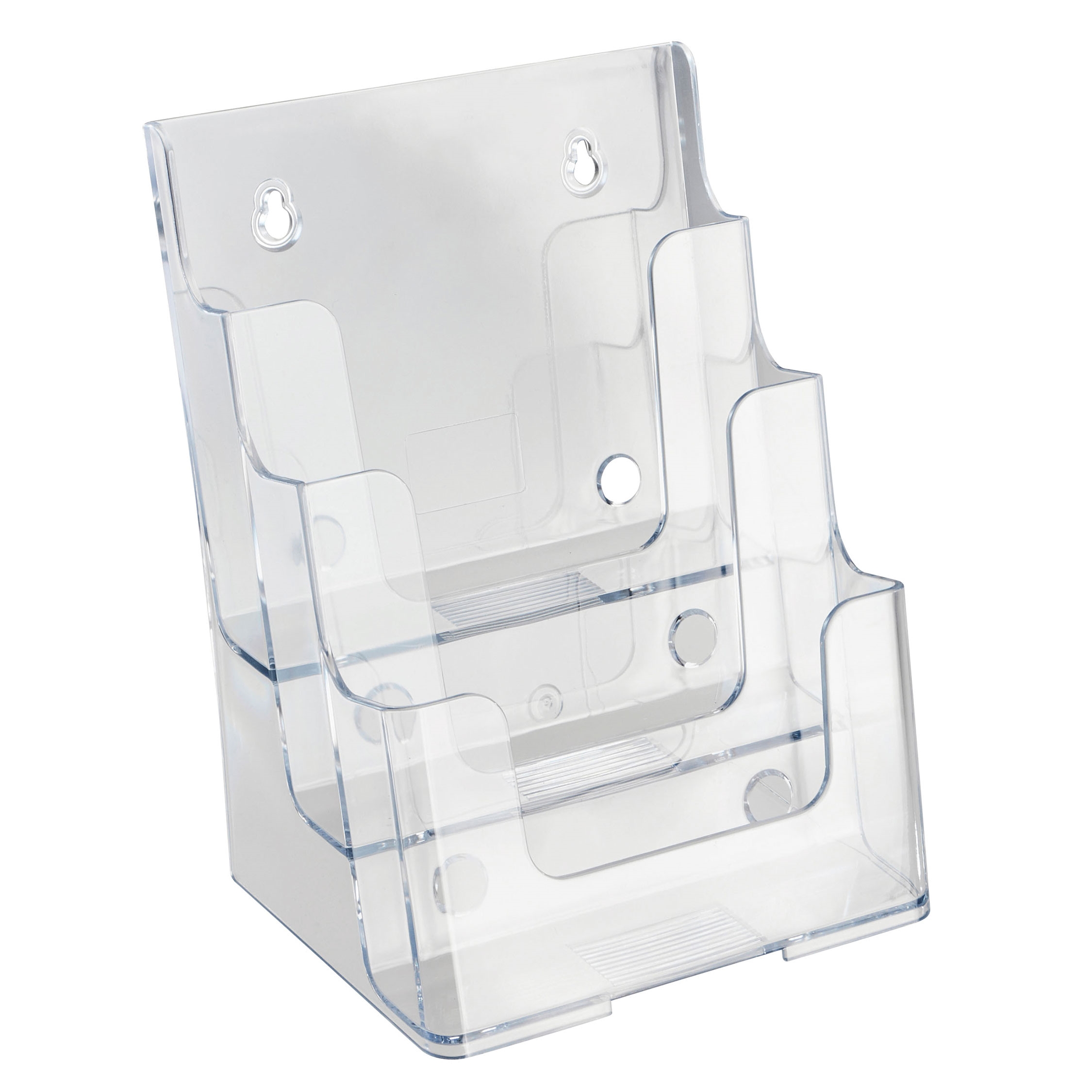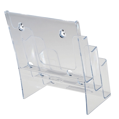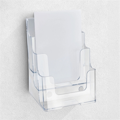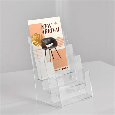 Brosjyreholder i klar akryl med tre rom i trappeform. Egner seg godt til fremvisning av A5-brosjyrer og flyers på bord eller disk. Brosjyrene står i ulik høyde og med svak bakovervinkling, slik at de er lette å se og ta med seg. Holderen kan stå fritt eller monteres på vegg via skruehull.