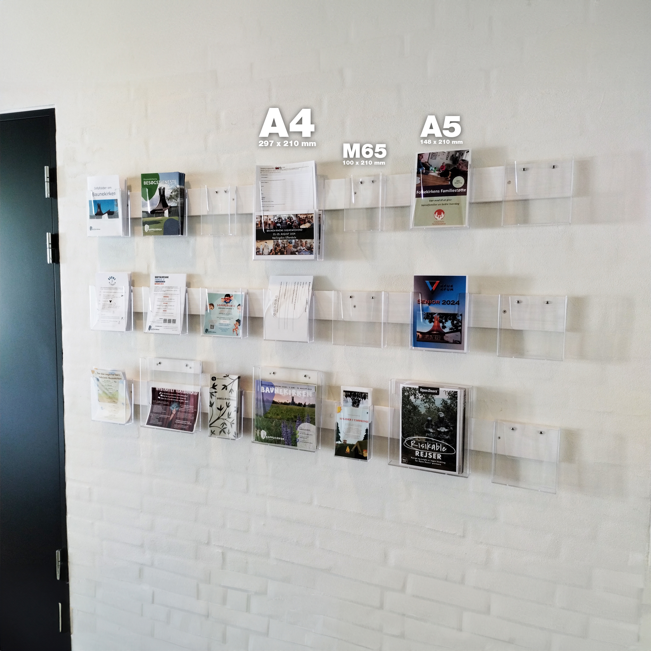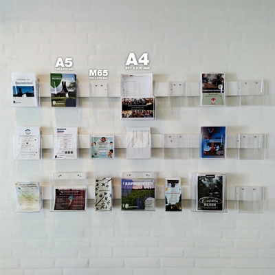 Brosjyreholderne i akryl til vegg finnes i både A4, A5 og A6-størrelse, som også passer perfekt til M65 (1/3 A4).