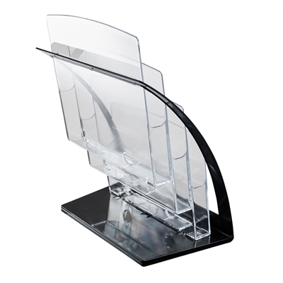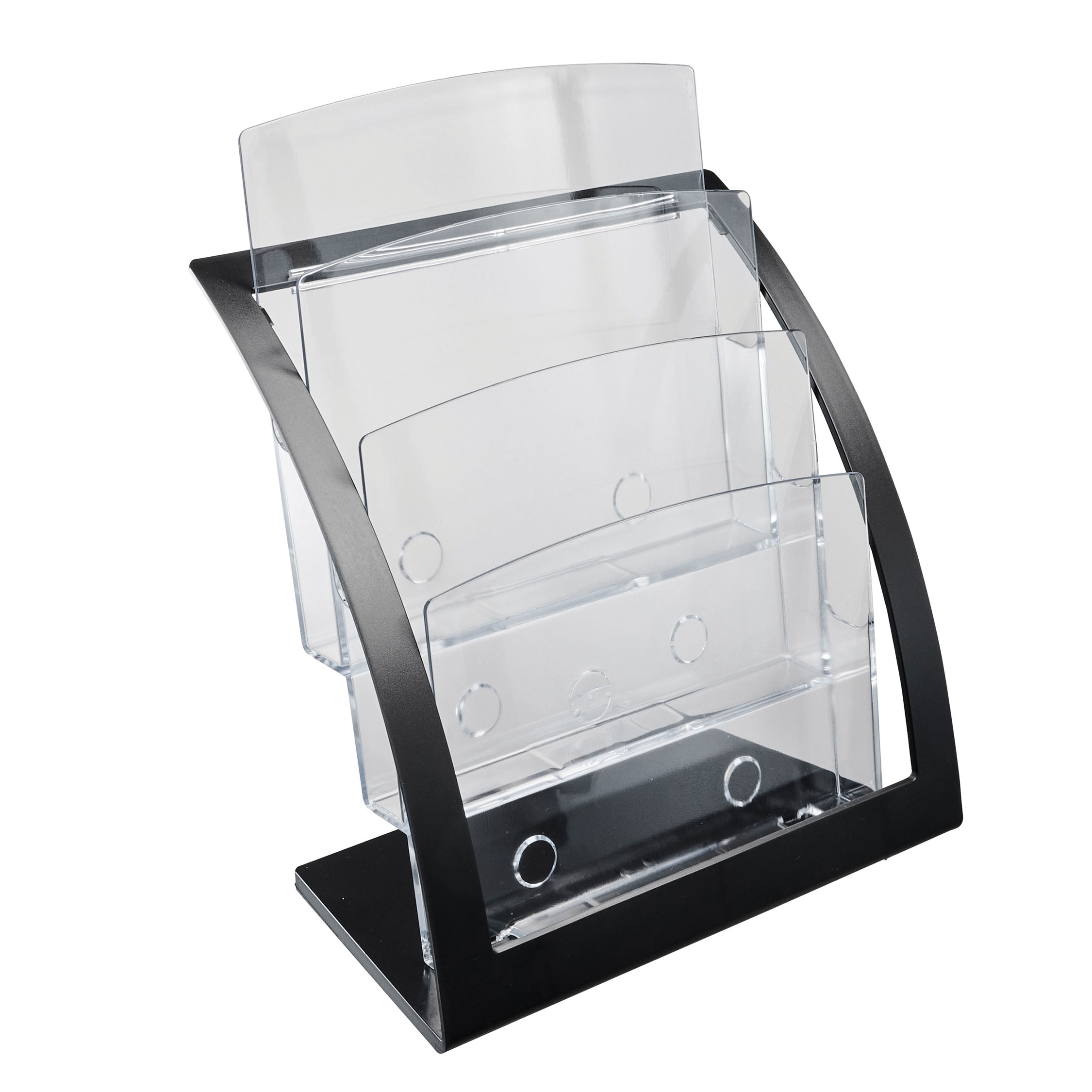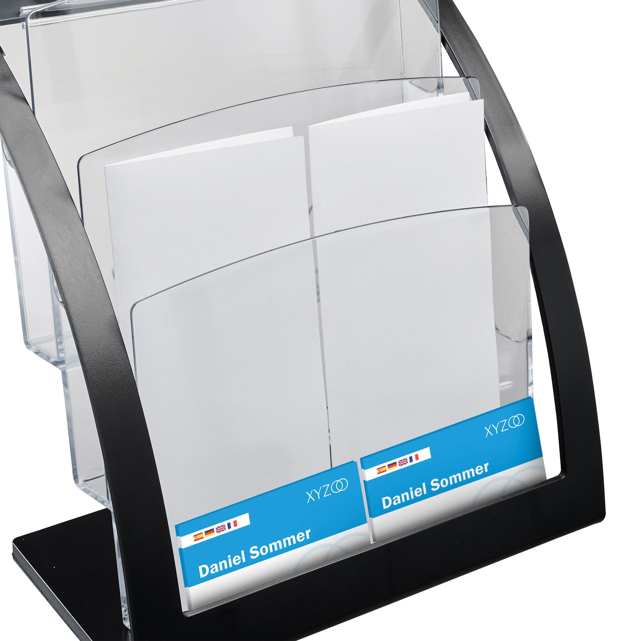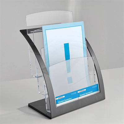 Moderne brosjyreholder i trappeform - passer perfekt på bord eller disk. De tre A4-rommene gir god plass til kataloger, brosjyrer eller magasiner. På fremsiden finnes det i tillegg to små lommer for visittkort.