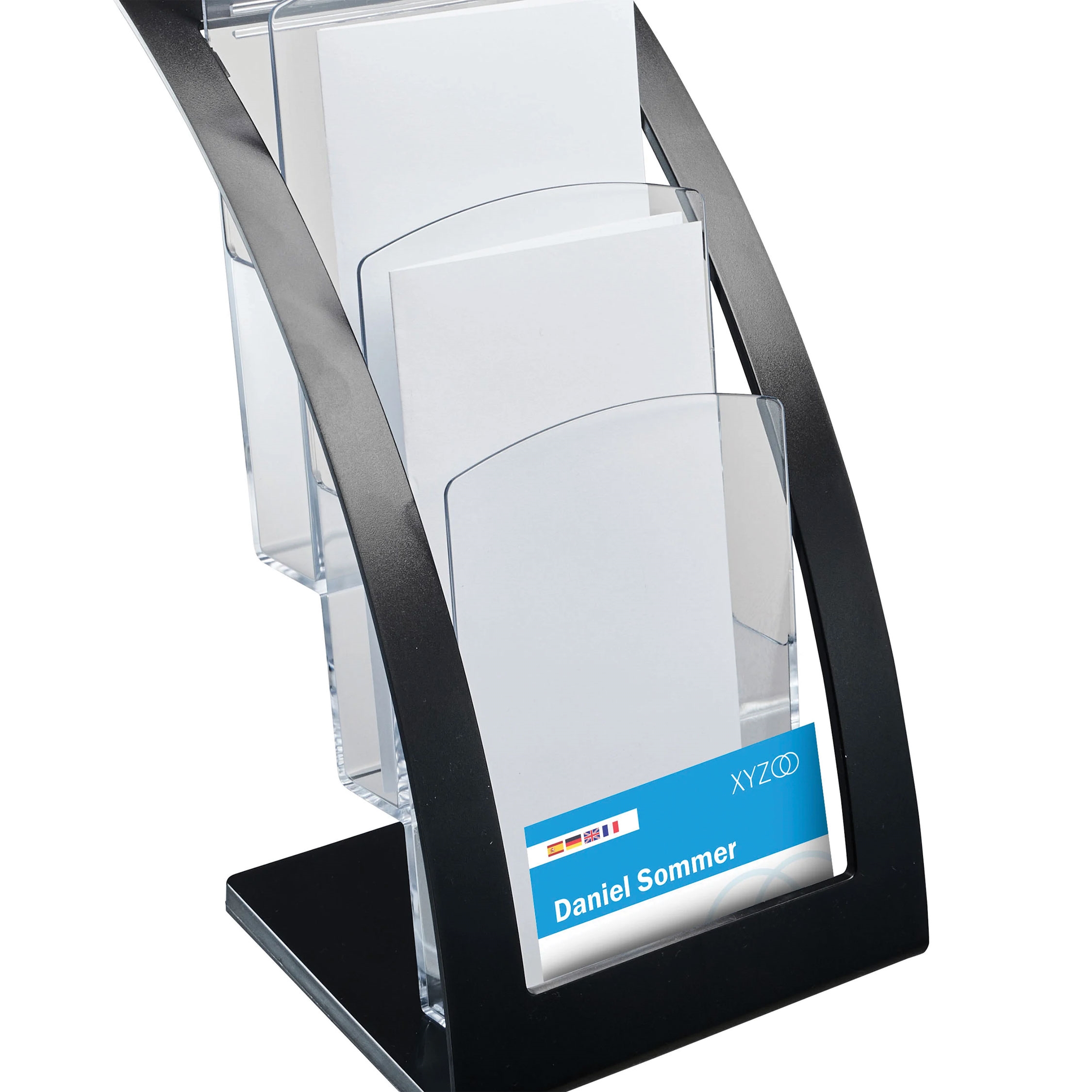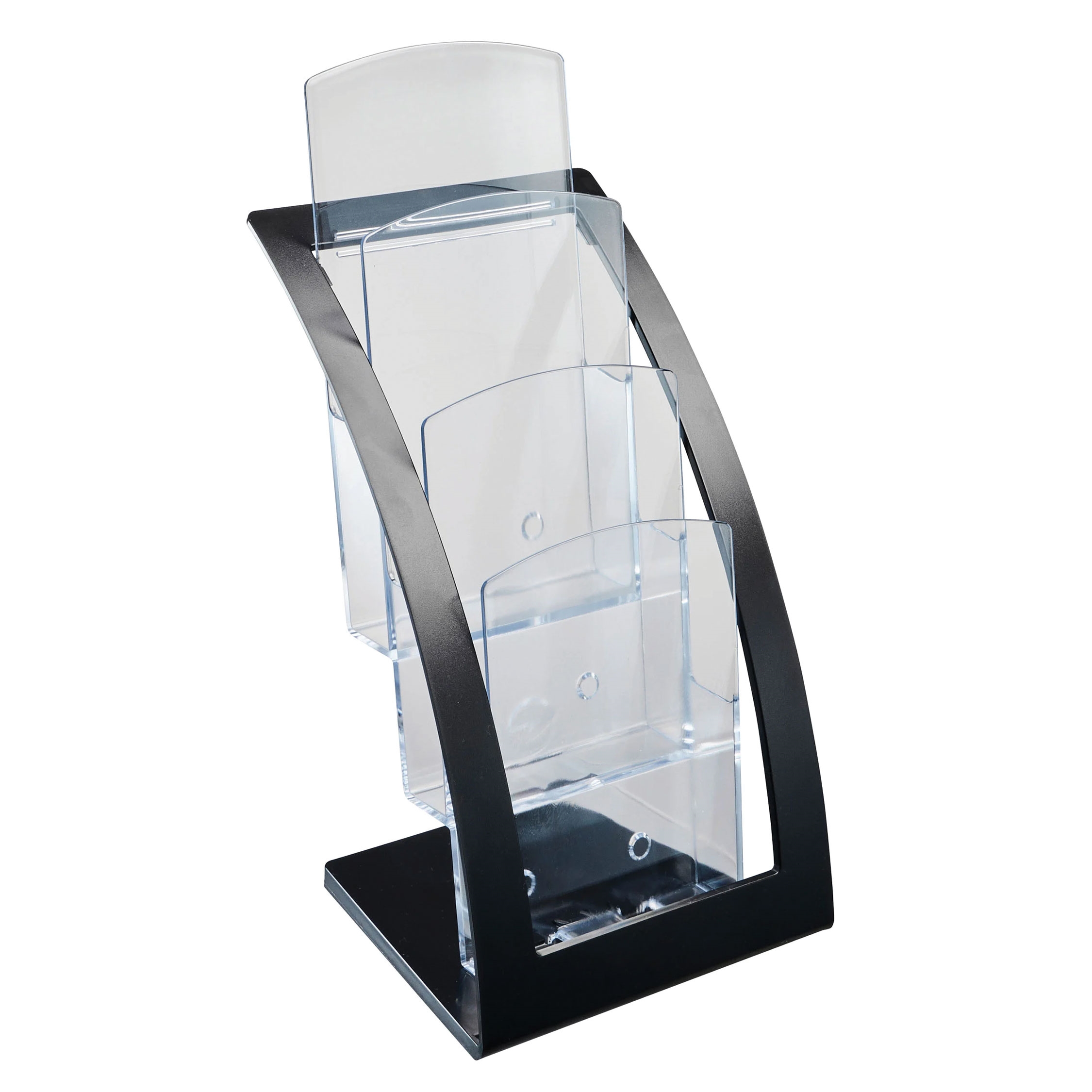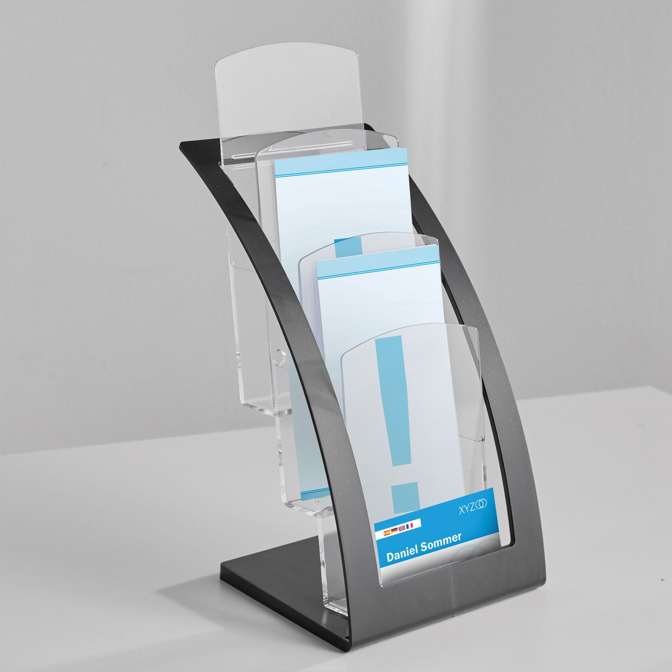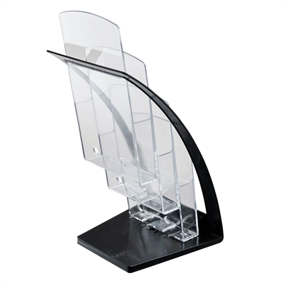 Moderne brosjyreholder i trappeform - passer perfekt på bord eller disk. De tre A6 / M65-rommene gir god plass til kataloger, brosjyrer eller magasiner. På fremsiden finnes det i tillegg to en lomme for visittkort.
