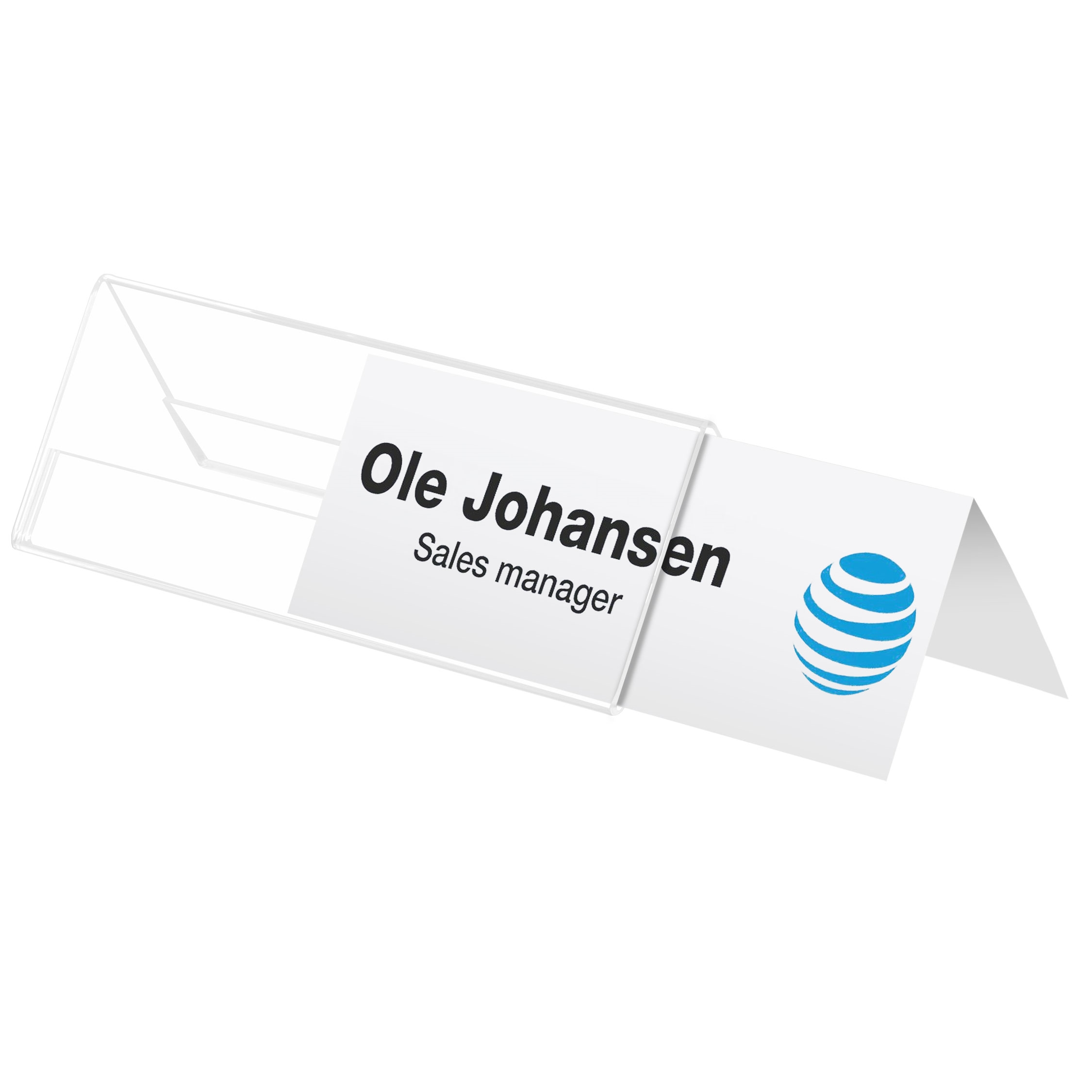 Disse elegante navneskiltene i klar akryl er perfekte for deg som ønsker en stilren og praktisk løsning for bordnavneskilt. De passer til papir foldet på langs i størrelsene A6, A5 og A4 og gjør det enkelt å bytte innhold.