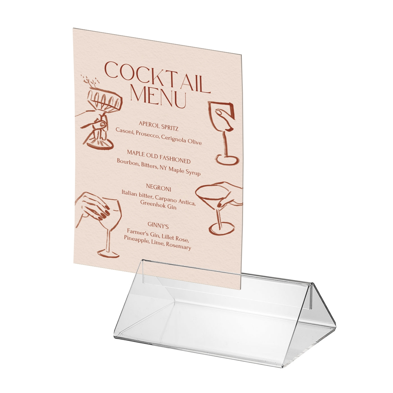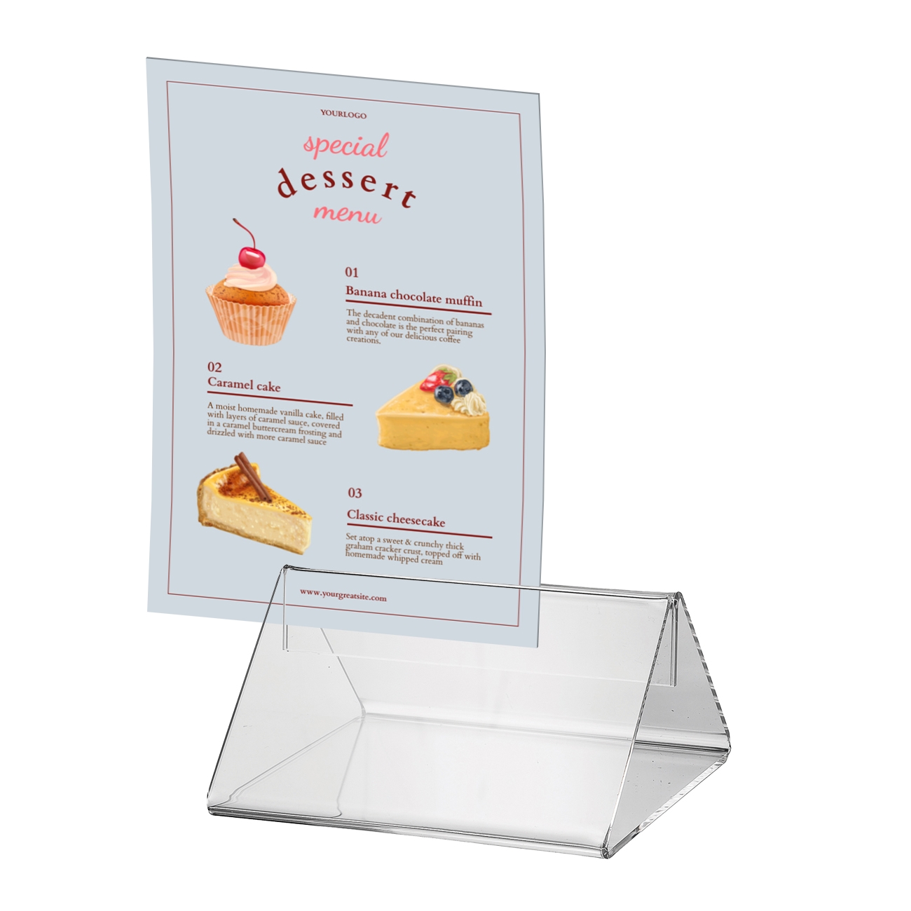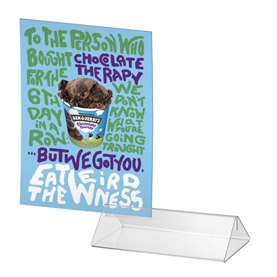 Disse praktiske og stilrene akryl-skiltholdere er perfekte for presentasjon av menyer eller informasjon på bord og disker. Det dobbeltsidige designet gjør det enkelt å vise innhold fra begge sider, og materialet sikrer rask og enkel utskifting. Den kompakte størrelsen gjør dem ideelle for mindre bord, mens den sterke akrylen gir en holdbar og profesjonell løsning.