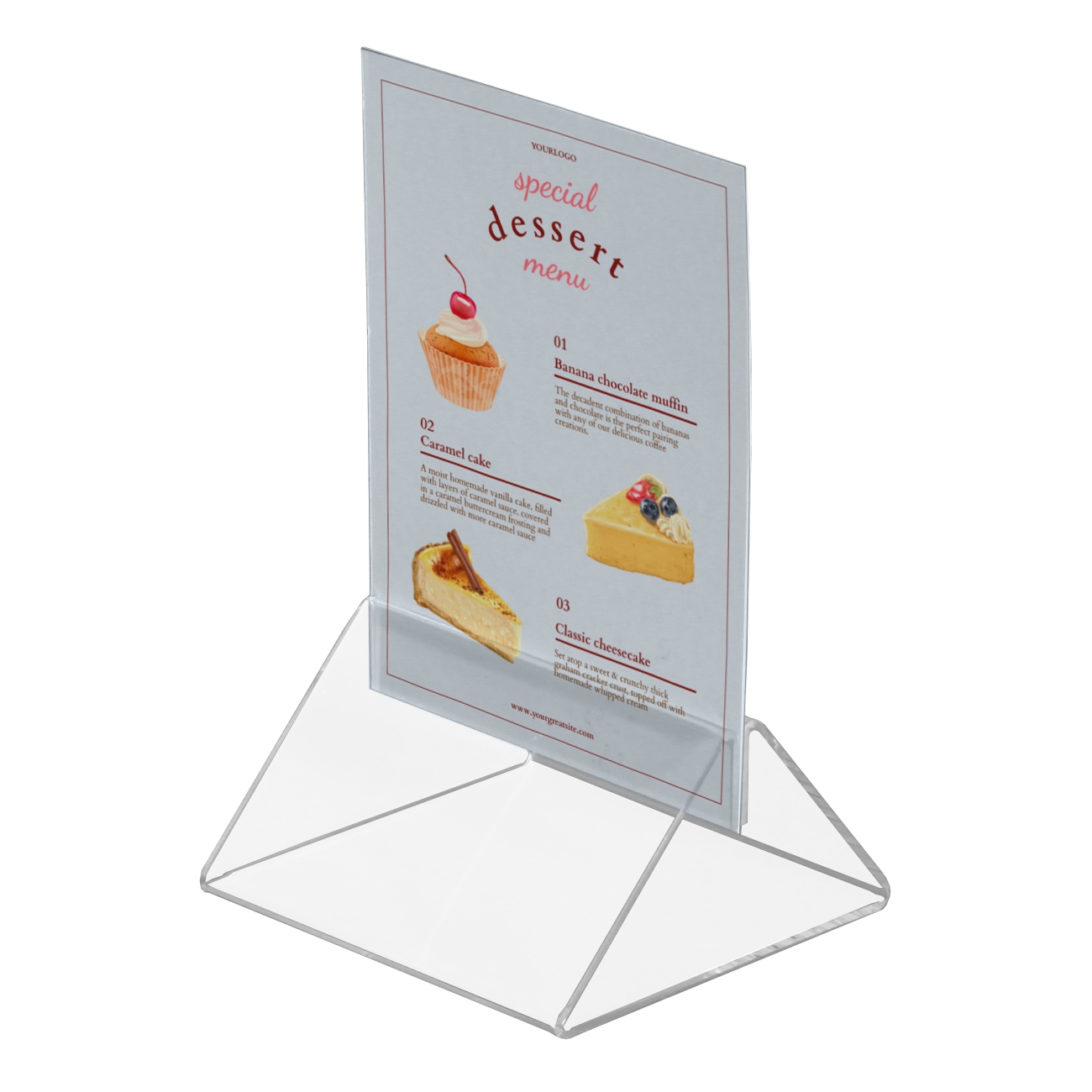 Denne smarte og gjennomsiktige akryl skiltholder er perfekt for presentasjon av menyer eller informasjoni A6 format på bord og disker. Det dobbeltsidige designet gjør det enkelt å vise informasjon fra begge sider, og innholdet kan raskt byttes ut etter behov.