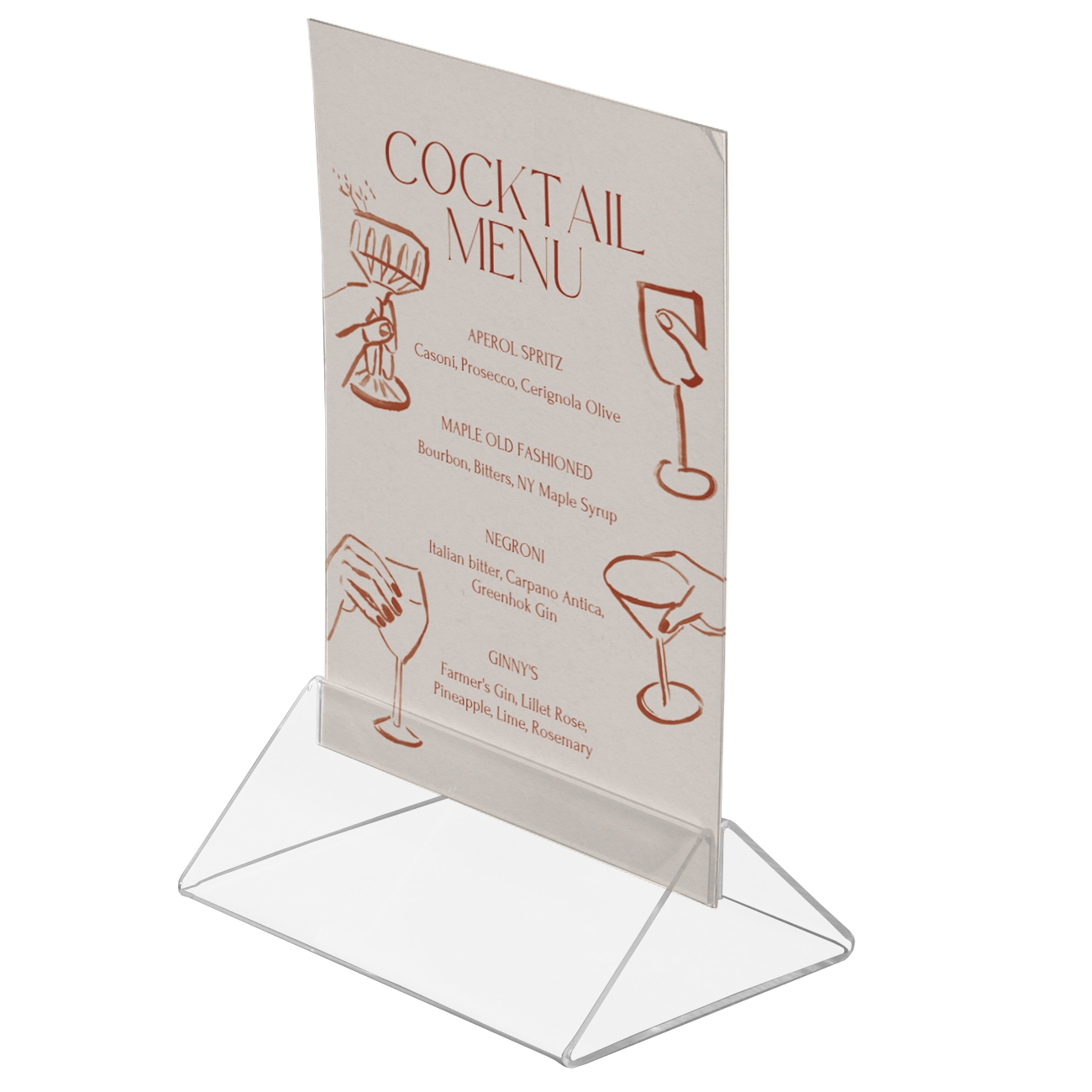 Denne smarte og gjennomsiktige akryl skiltholder er perfekt for presentasjon av menyer eller informasjon i A5 format på bord og disker. Det dobbeltsidige designet gjør det enkelt å vise informasjon fra begge sider, og innholdet kan raskt byttes ut etter behov.