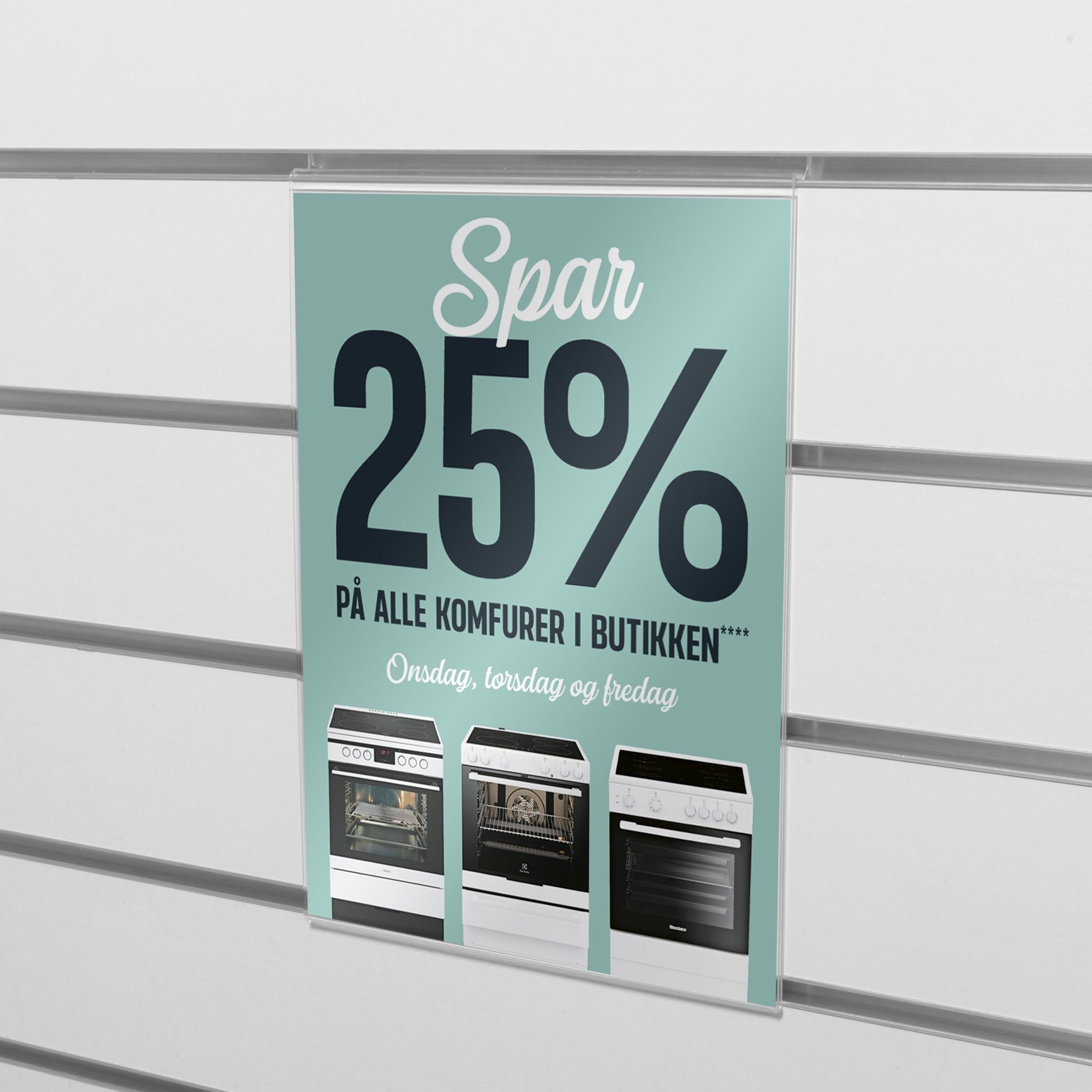 Skiltholderen er enkel å montere og utskifting av innhold gjøres raskt og enkelt. Designet passer for mange typer butikker, inkludert: Dagligvarebutikker, kjøpesentre, hvitevareforhandlere, butikkjeder og mange andre!