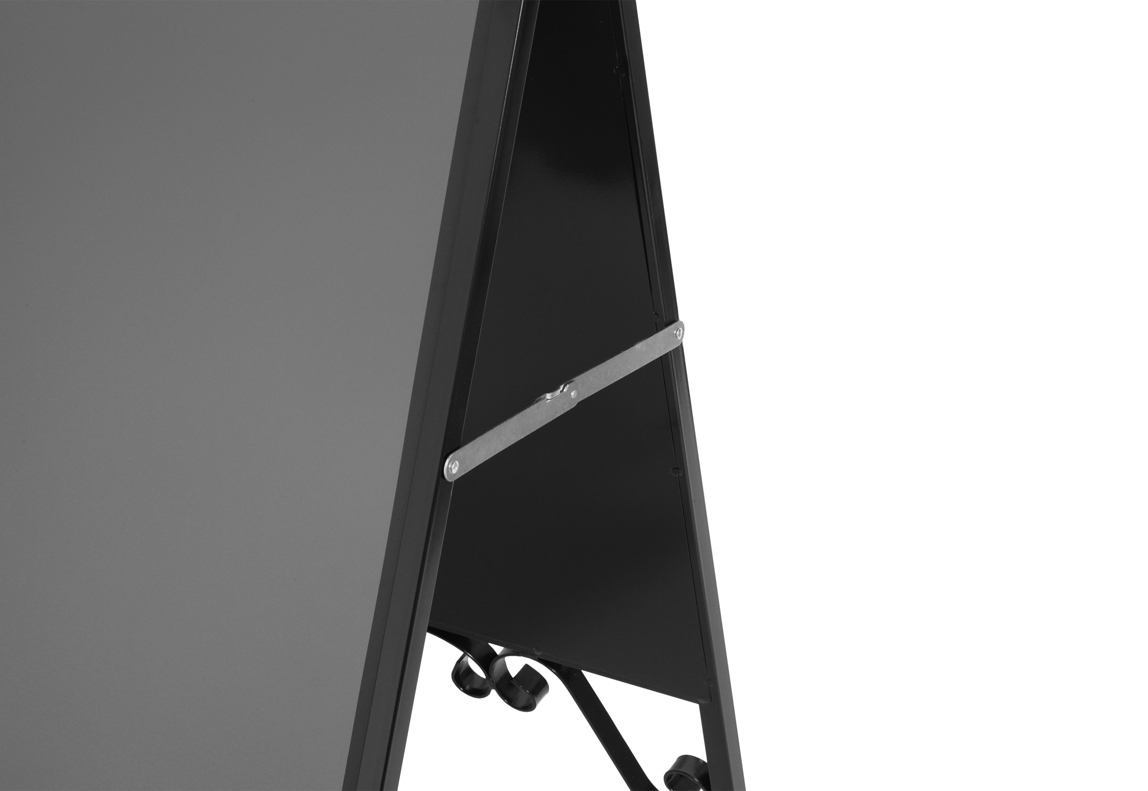 Gatebukken er produsert i 20 x 20 mm polyesterlakkert, firkantet rør. Vi lover deg en stabil konstruksjon, og skilten veier 16 kg, så det er ikke noe at rokke med, men står sikkert i gatebildet. Skilteflatene er fremstilt i rustfri kvalitet, og plakatene beskyttes utmerket av A-PET 1 mm antirefleks frontplater som i øvrig har en flott, svart kantdekorasjon.