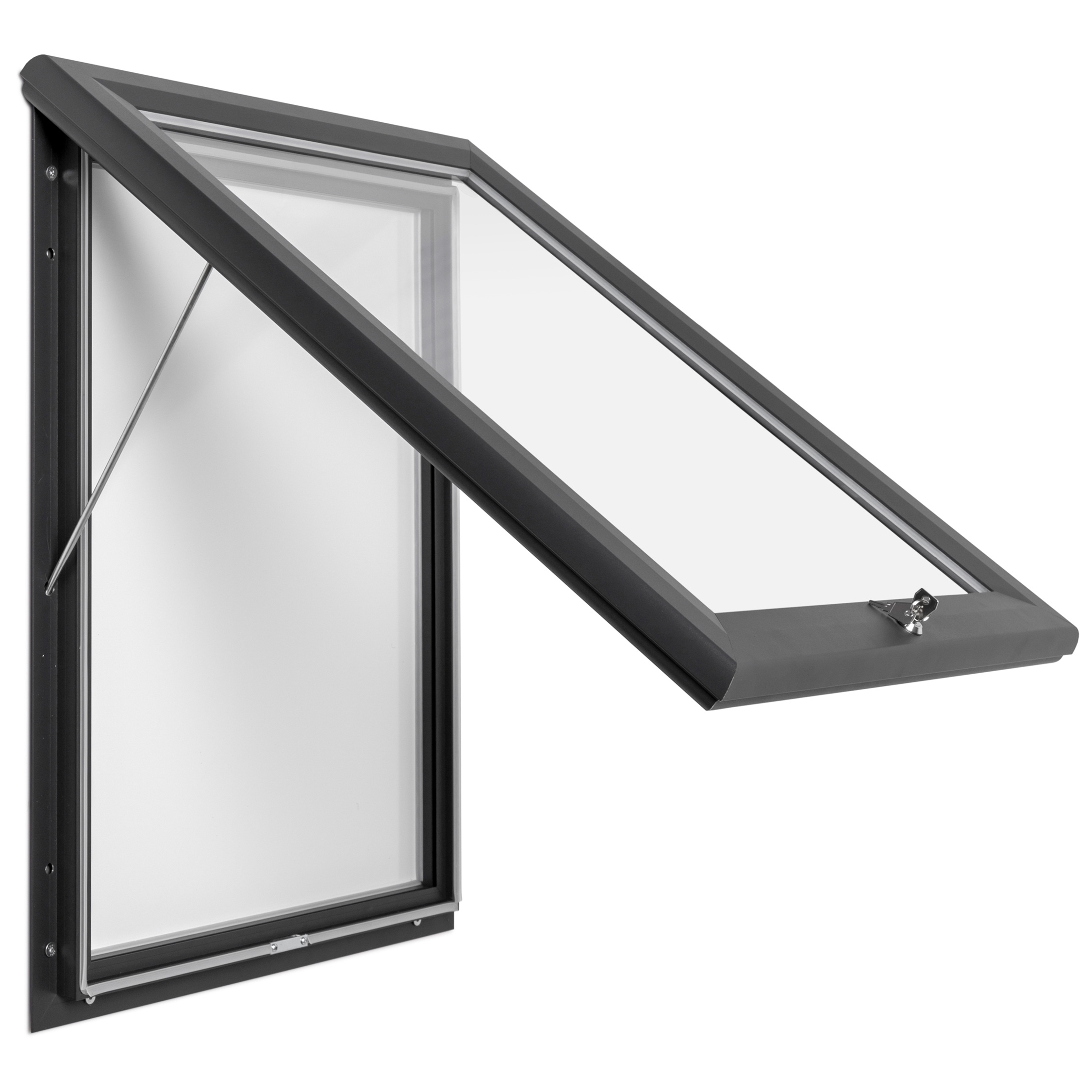 På våres antracit premium uthengsskap i størrelsene: 4xA4, 6xA4, 8xA4 og 9xA4 er topphengslet og montert med en stang som holder døren åpen, samtidig som du skifter plakatene / oppslagene.