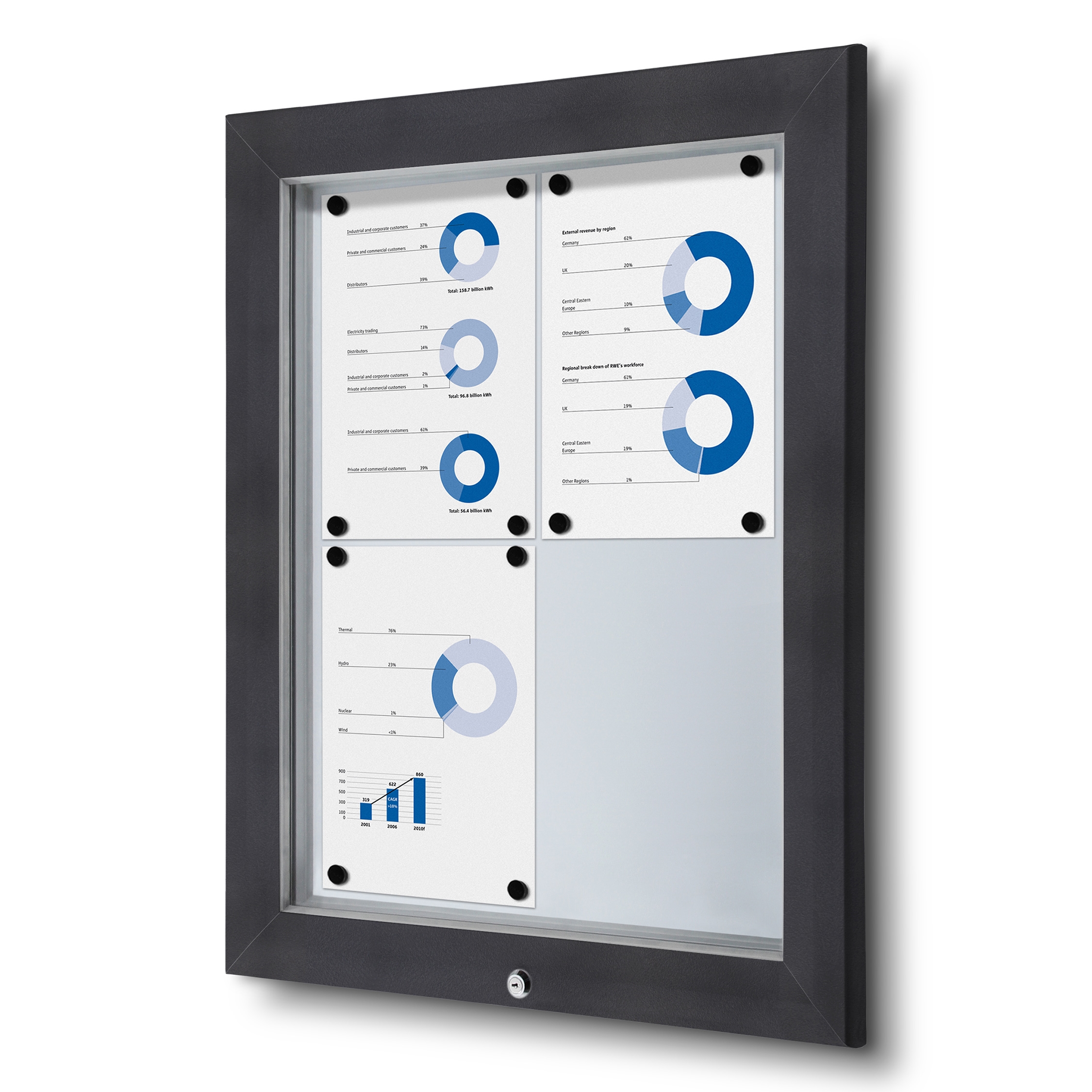 På våres antracit premium uthengsskap i størrelsene: 4xA4, 6xA4, 8xA4 og 9xA4 er topphengslet og montert med en stang som holder døren åpen, samtidig som du skifter plakatene / oppslagene.