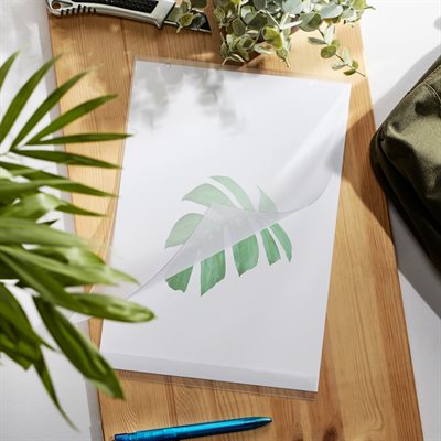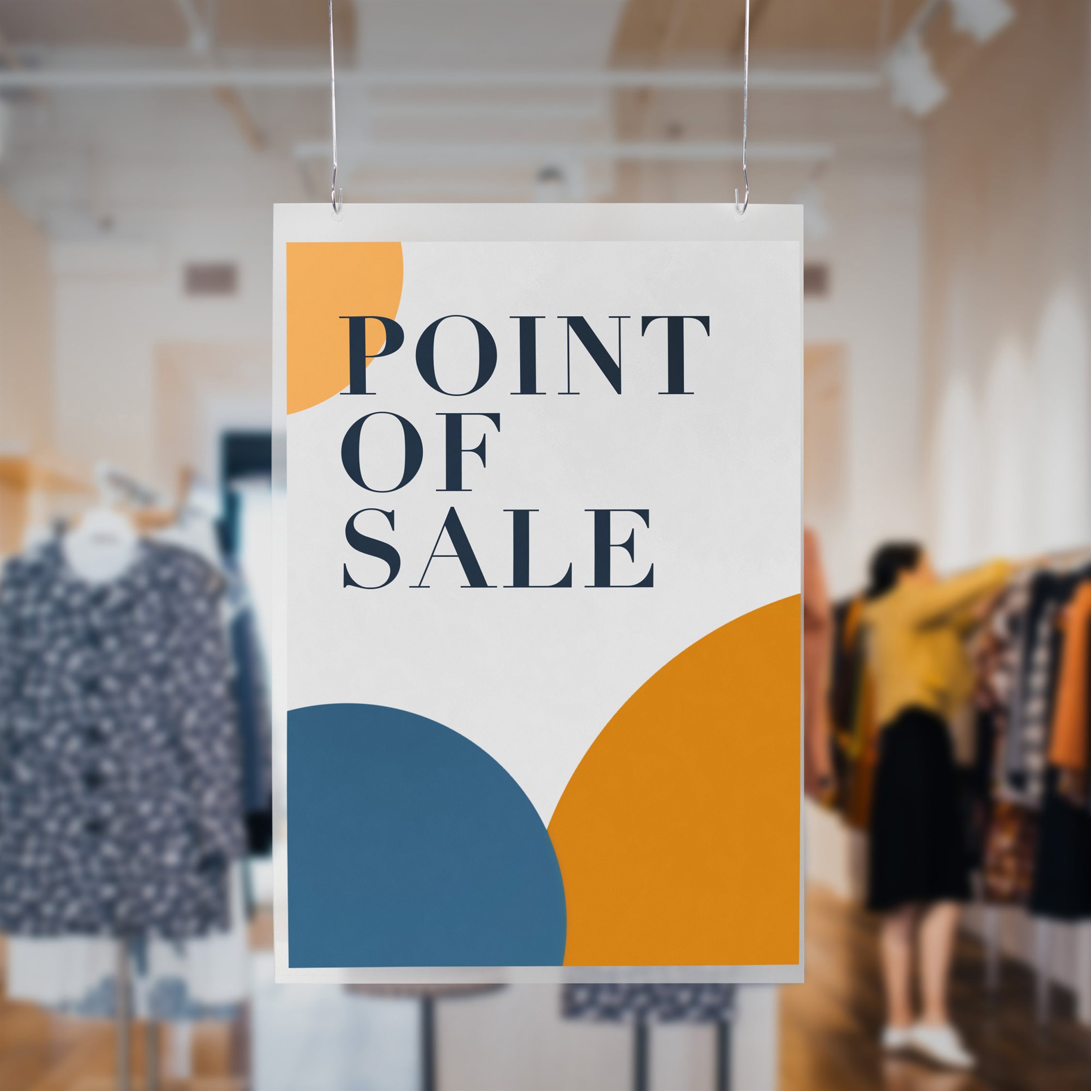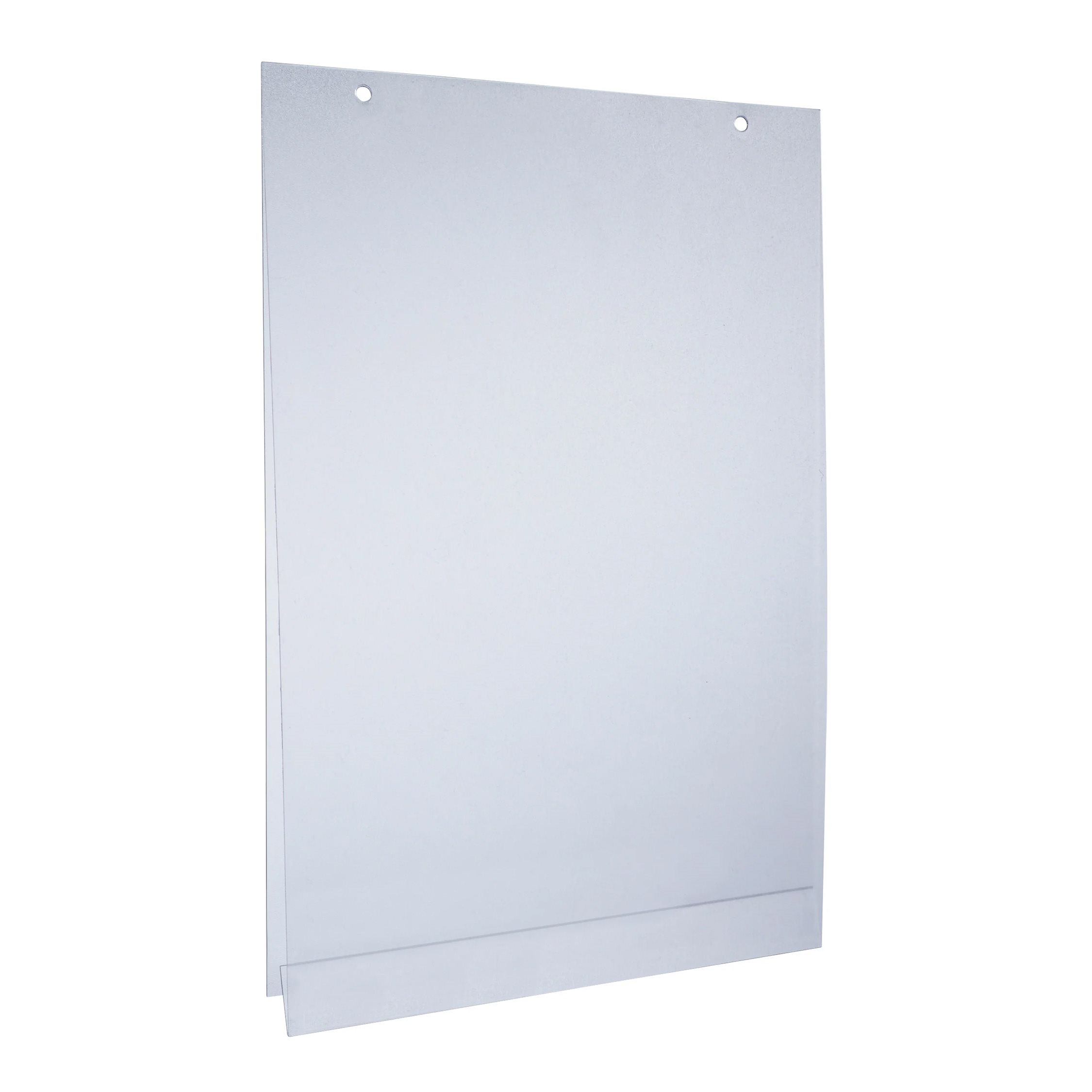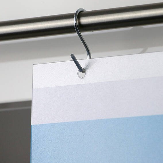 En klassisk plakatlomme av APET plast, forsterket med to metalløyer til oppheng fra tak eller varekurve / salgskurve.