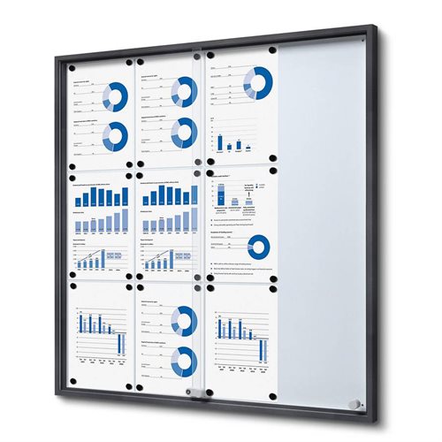 Skap laget av metall og aluminium, magnetisk skrivbar innvendig 12xA4 whiteboard tavle, med en dybde på 23 mm, slank antrasittgrå profilramme, skyvedører av 4 mm sikkerhetsglass med innebygd lås. 2 nøkler følger med. Kan brukes med whiteboard-tusjer og magneter.