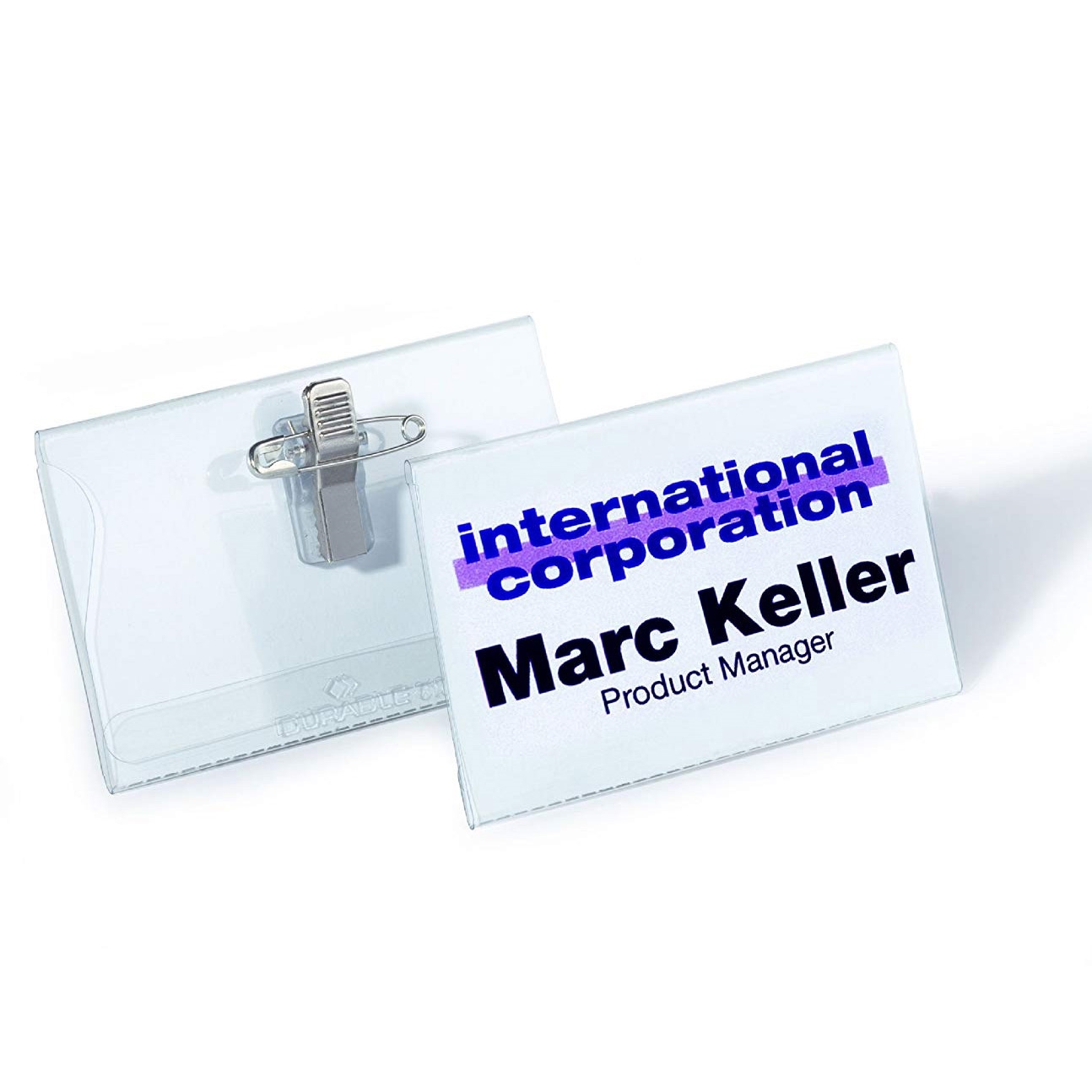 Navneskilt 40x75mm med sikkerhetsnål og klemme som gir valgmulighet til å sette fast på tøjet.
