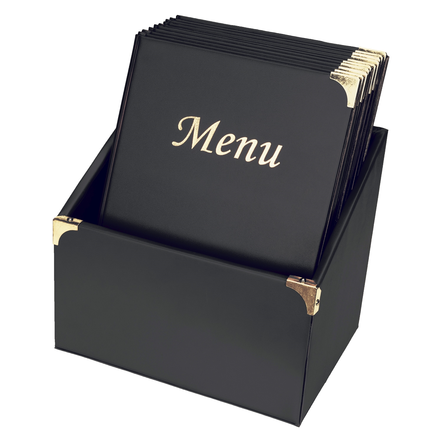 Set med 10 stk elegante lær-look menyholdere / menyomslag med gullfargede "Meny" print på forsiden og gullfarget metallhjørner.