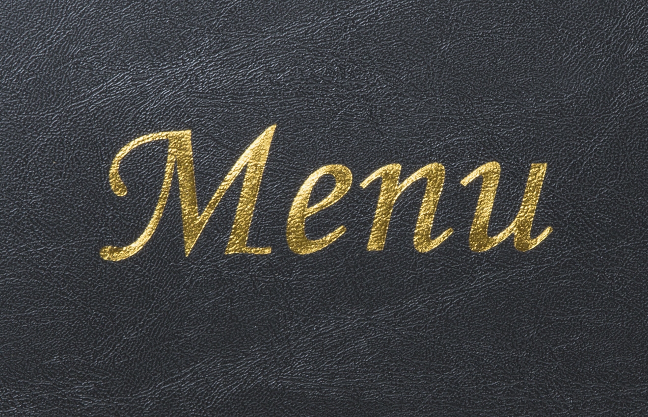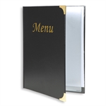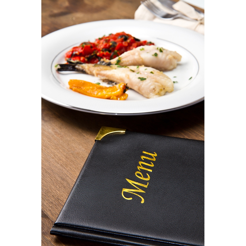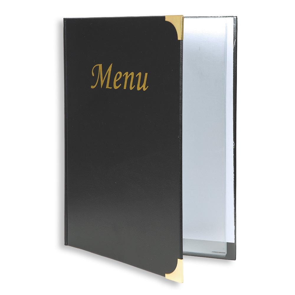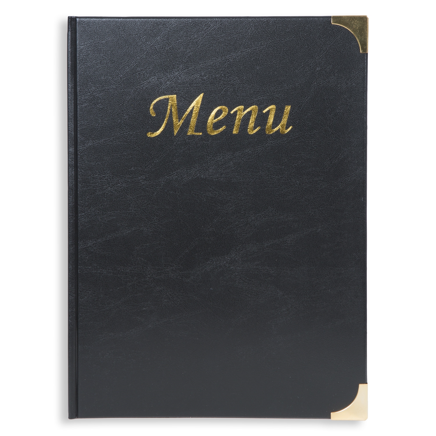 Elegante lær-look menyholdere / Menyperme med gullfargede "Meny" print på forsiden og gullfarget metallhjørner.