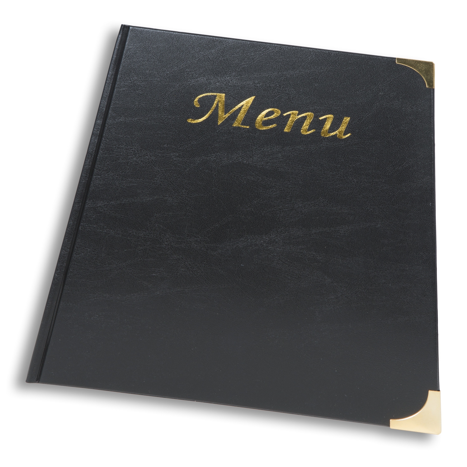 Elegante lær-look menyholdere / Menyperme med gullfargede "Meny" print på forsiden og gullfarget metallhjørner.