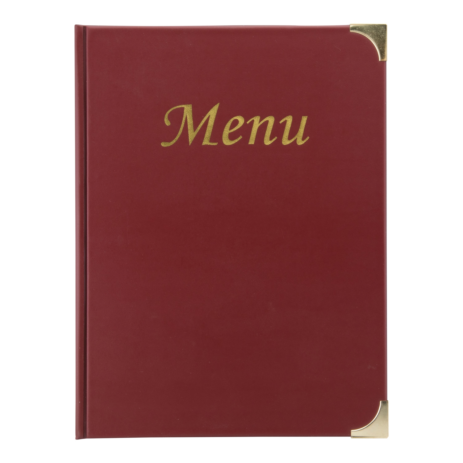 Elegante Vin-rød lær-look menyholdere / Menyperme med gullfargede "Meny" print på forsiden og gullfarget metallhjørner.