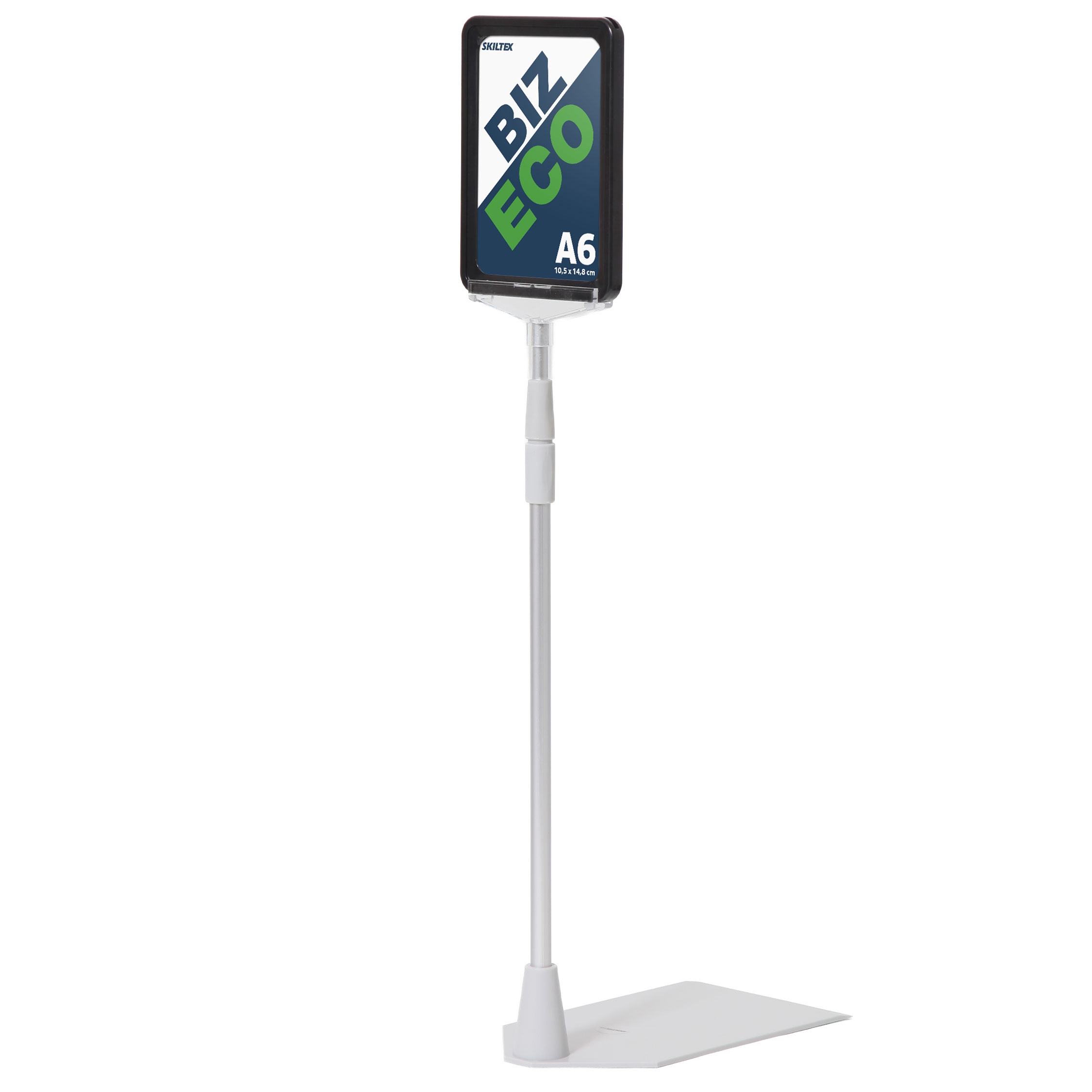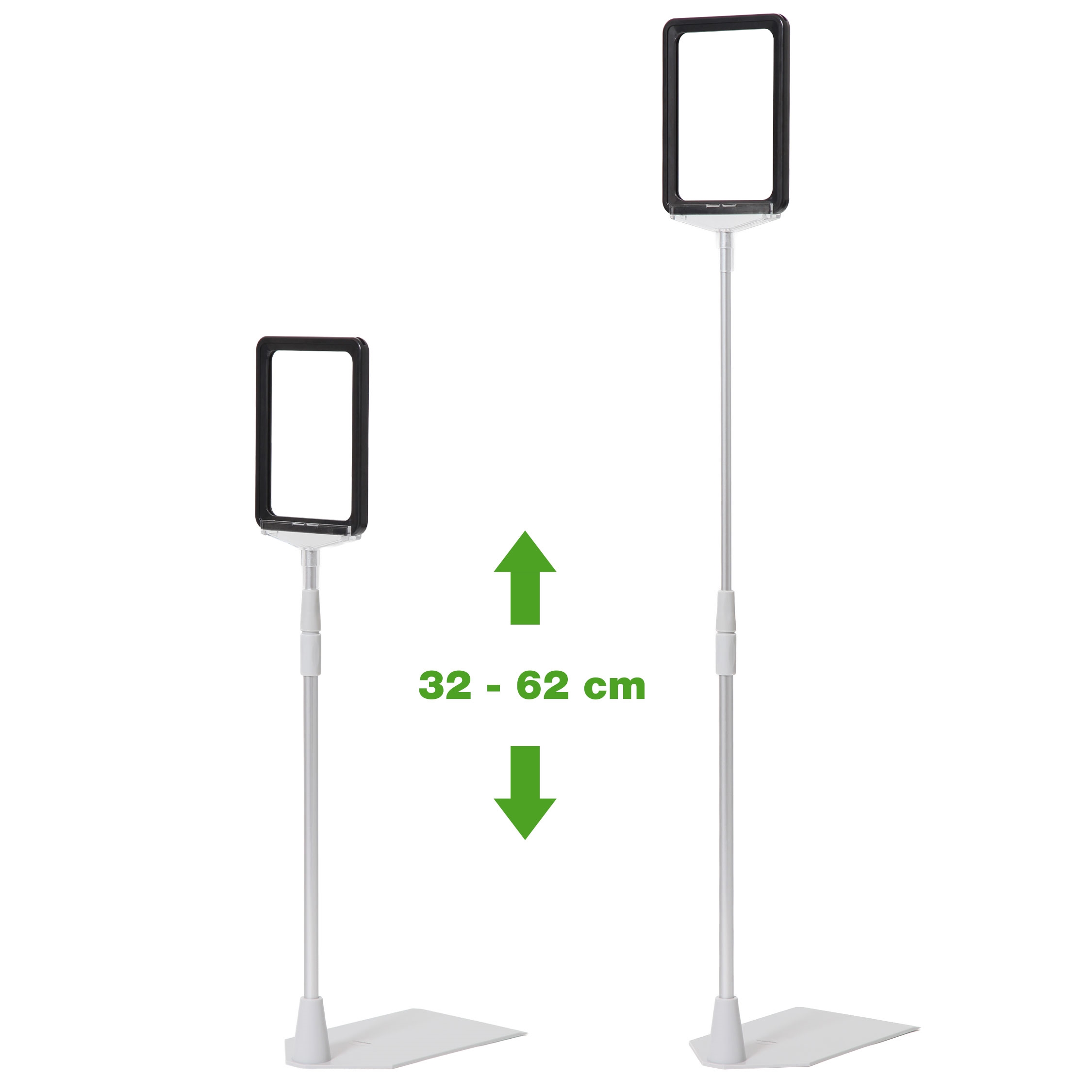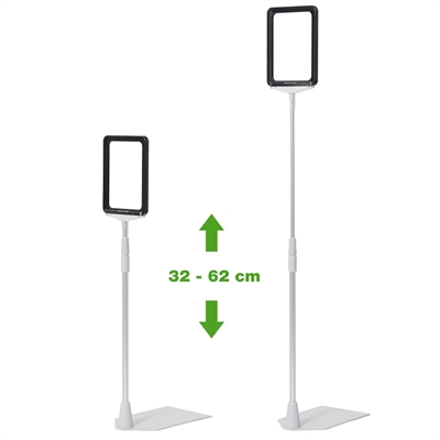 Lavpris skiltstativ, som leveres med teleskopstang i aluminium, som kan justeres i høyden fra 32 - 62 cm og en grå lett plastfot.