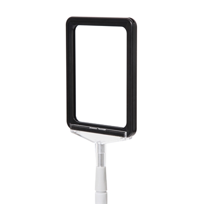 Klar T-holder øverst på stangen passer til alle fargerammer. Rammen er laget av sort plast og har åpning i toppen (høyt format / vertikalt).