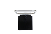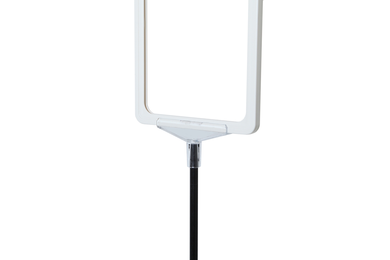 Skiltholderen er utstyrt med svart teleskopstang, som kan justeres fra 32 til 62 cm i høyden, samt hvit plastramme med åpning i toppen (høyt format).