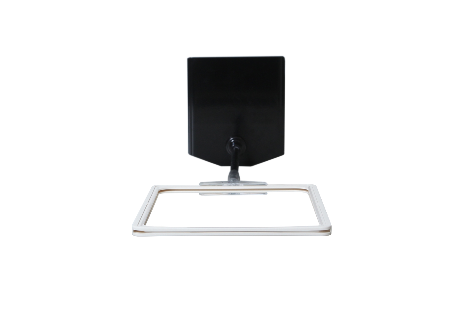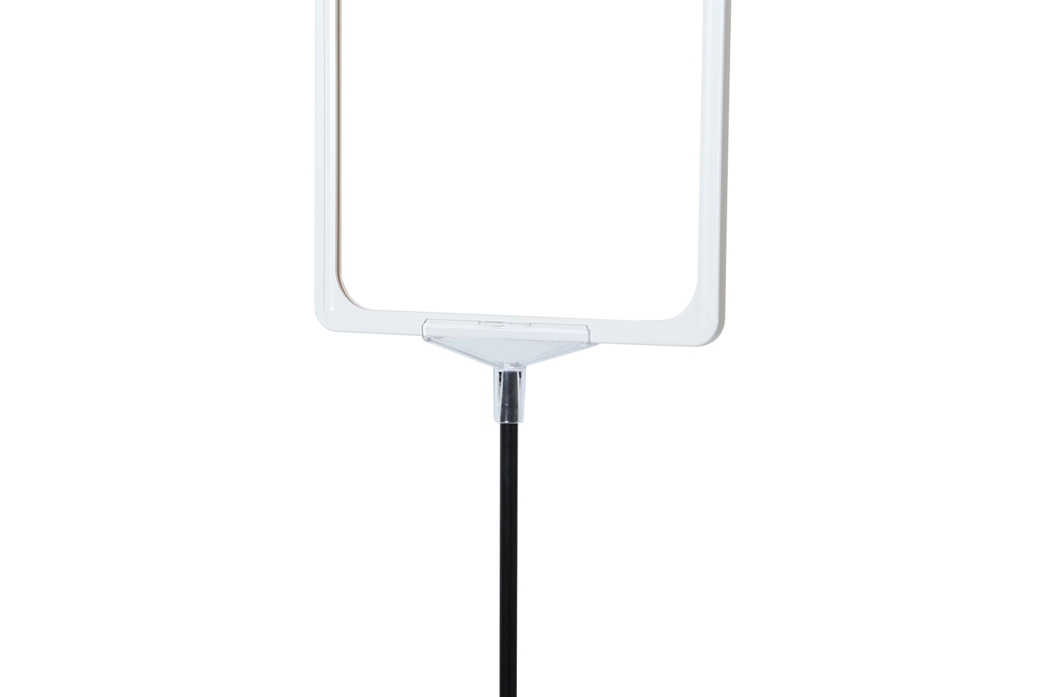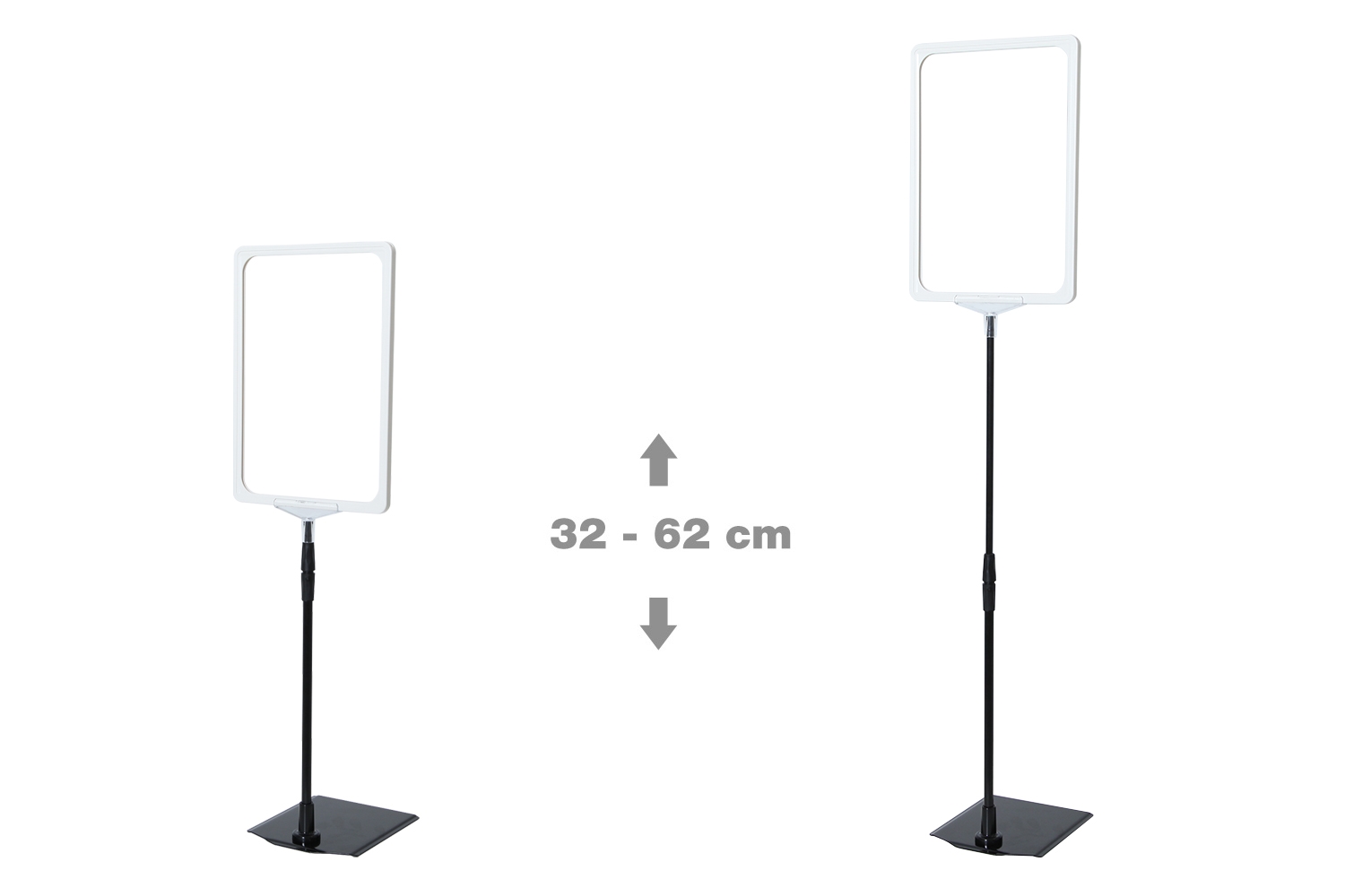 Skiltholderen er utstyrt med svart teleskopstang, som kan justeres fra 32 til 62 cm i høyden, samt hvit plastramme med åpning i toppen (høyt format).
