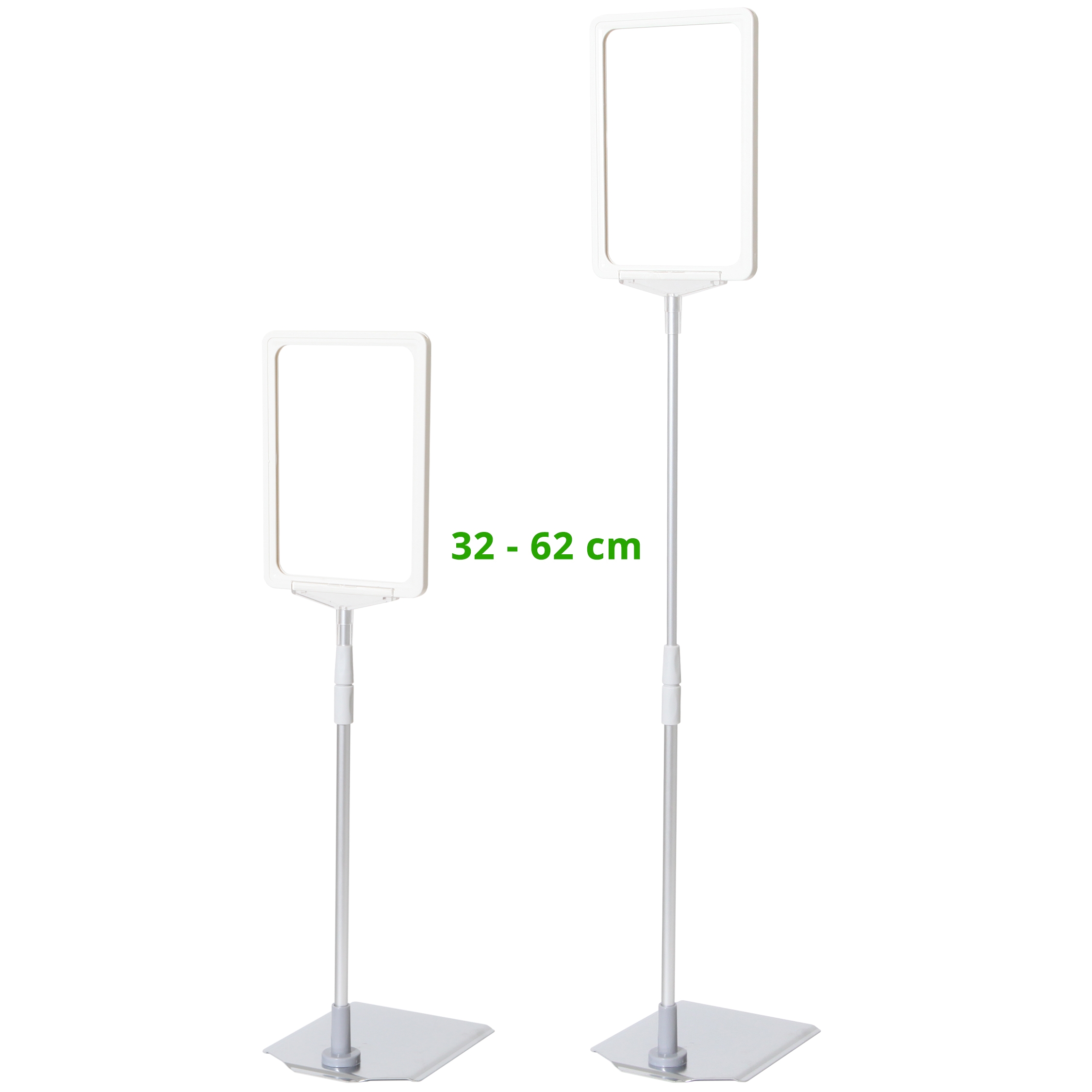 Skiltholder av topp kvalitet med en flott, tung og stabil metallfot med krom overflate, justerbar sølveloksert aluminium teleskopstang (32 til 62 cm) og hvit ABS-plastramme i A5-størrelse.