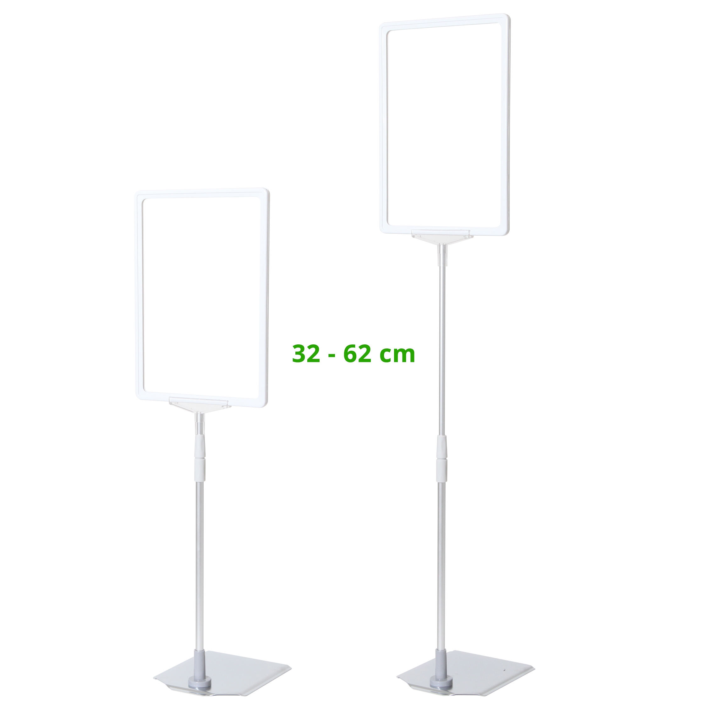 Skiltholder av topp kvalitet med en flott, tung og stabil metallfot med krom overflate, justerbar sølveloksert aluminium teleskopstang (32 til 62 cm) og hvit ABS-plastramme i A4-størrelse.