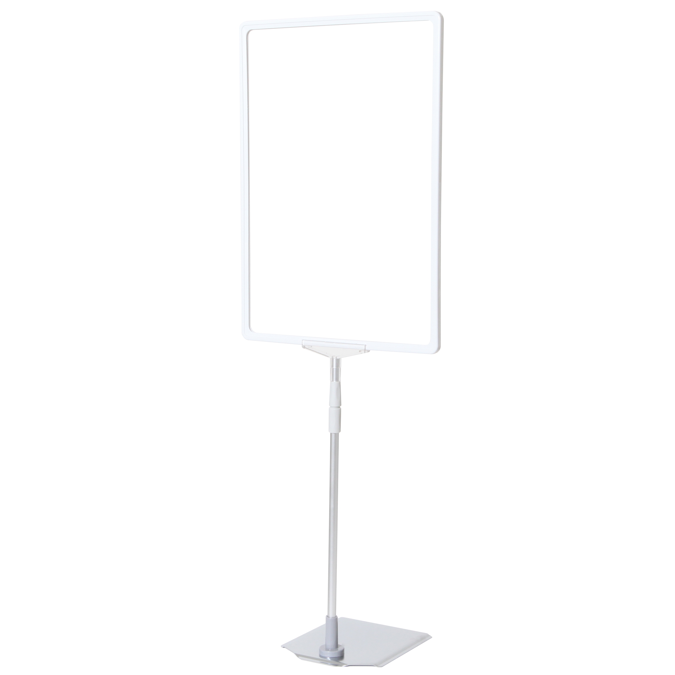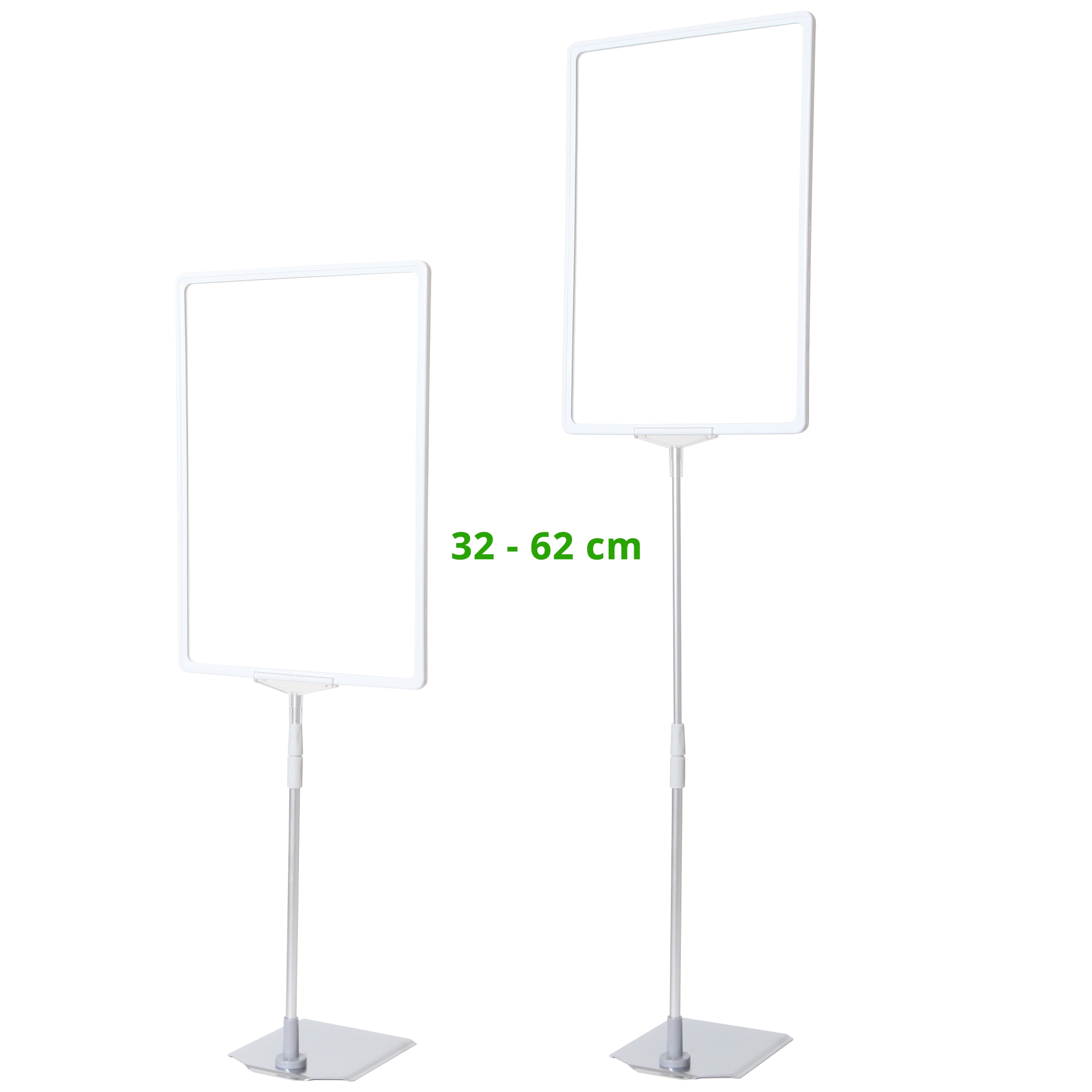 Skiltholder av topp kvalitet med en flott, tung og stabil metallfot med krom overflate, justerbar sølveloksert aluminium teleskopstang (32 til 62 cm) og hvit ABS-plastramme i A3-størrelse.