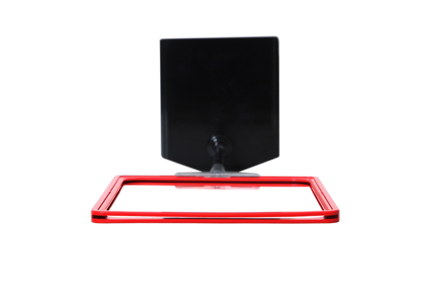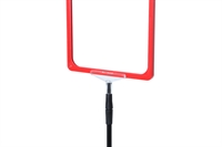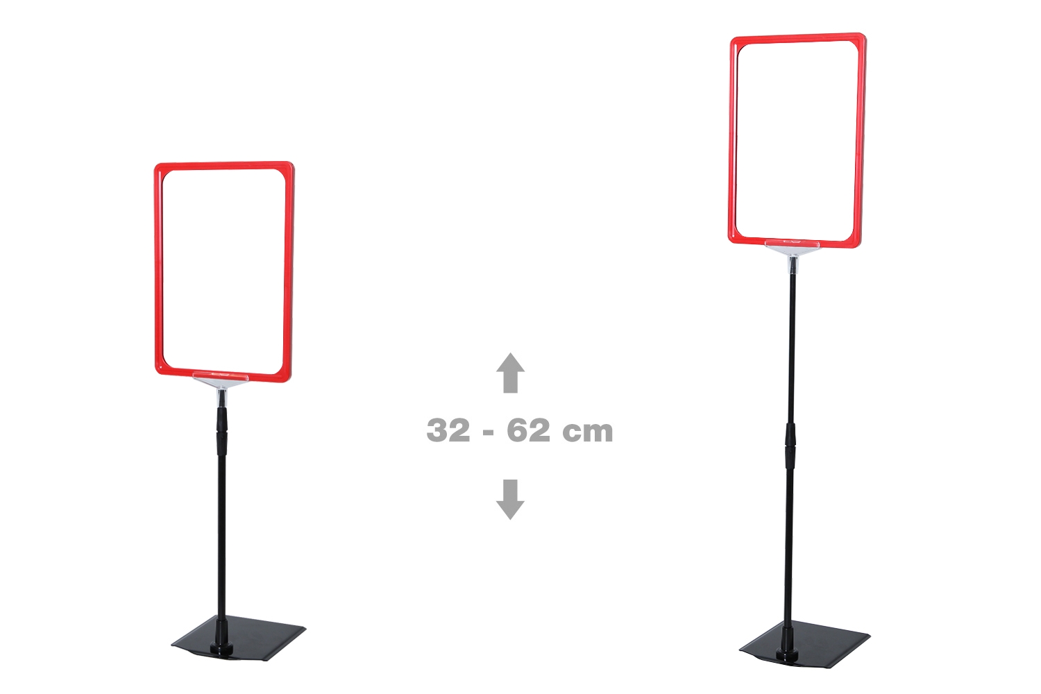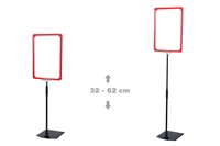 Skiltholderen er utstyrt med svart teleskopstang, som kan justeres fra 32 til 62 cm i høyden, samt rød plastramme med åpning i toppen (høyt format).