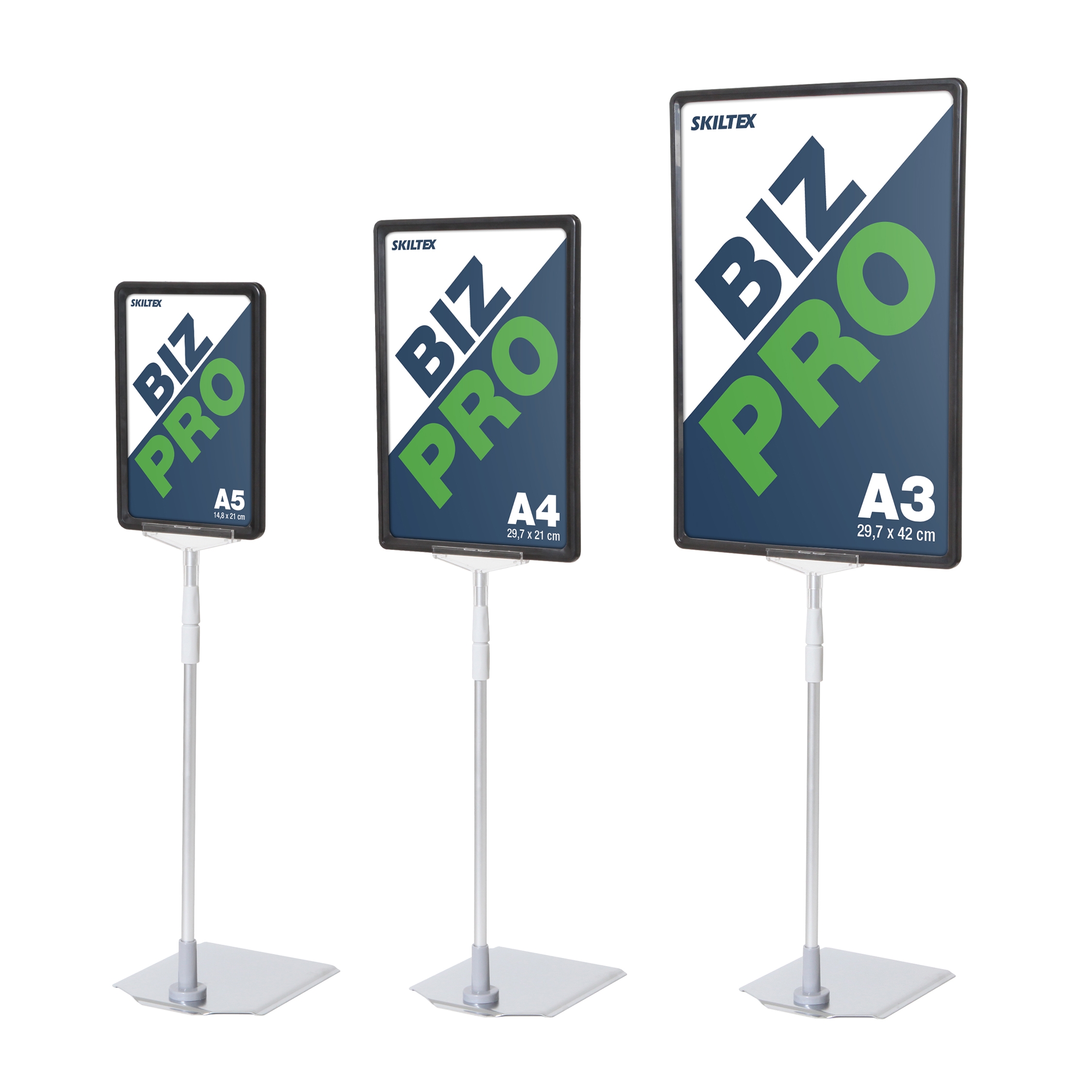SKILTEX Biz Pro Skiltholder er perfekt for detaljhandel. Med sitt enkle og iøynefallende design kan Biz Pro brukes både innendørs og utendørs til visning av tilbud og budskap i A5, A4 eller A3 størrelse (stående format).