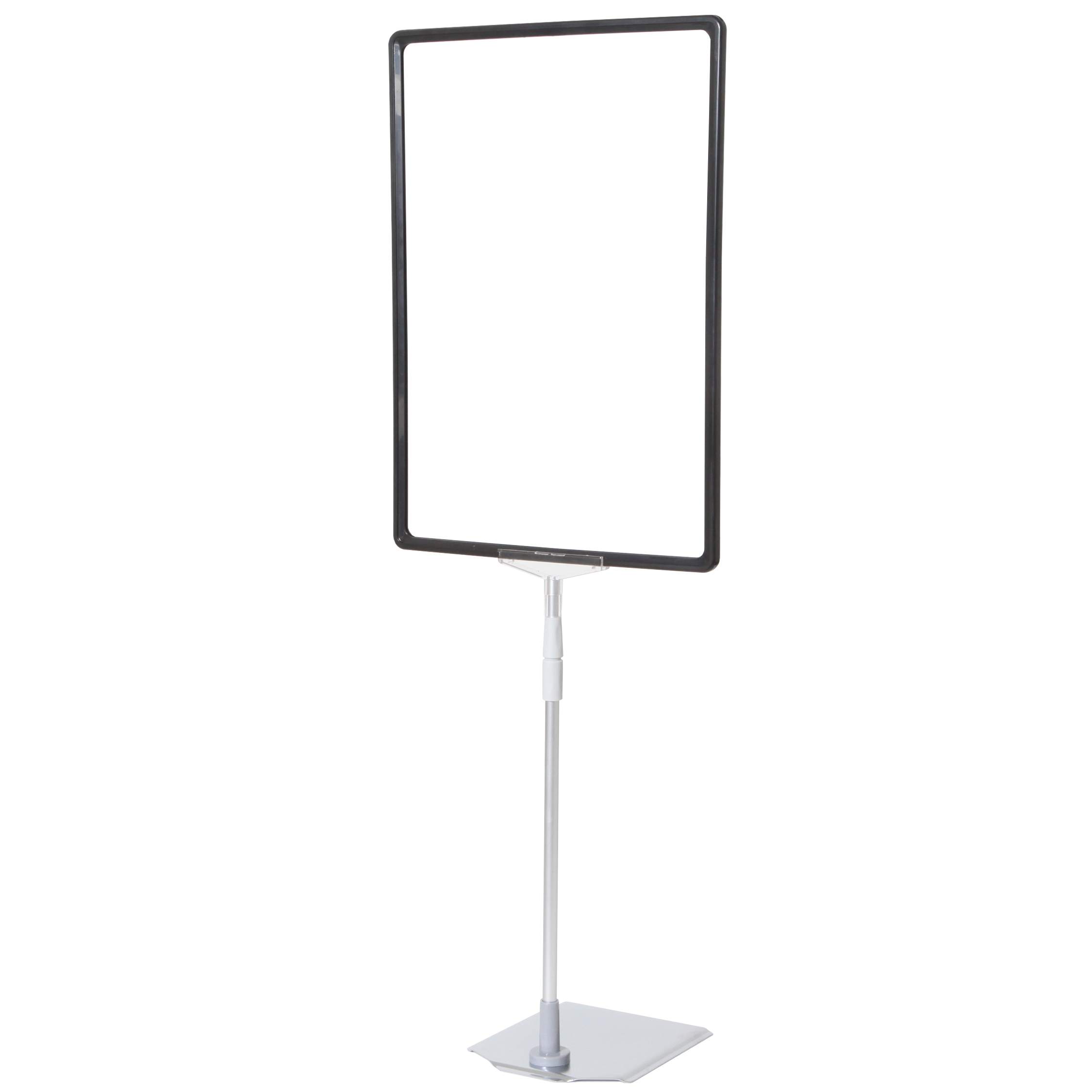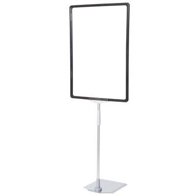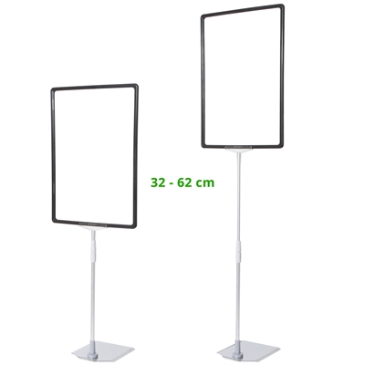 Skiltholder av topp kvalitet med en flott, tung og stabil metallfot med krom overflate, justerbar sølveloksert aluminium teleskopstang (32 til 62 cm) og svart ABS-plastramme i A3-størrelse.
