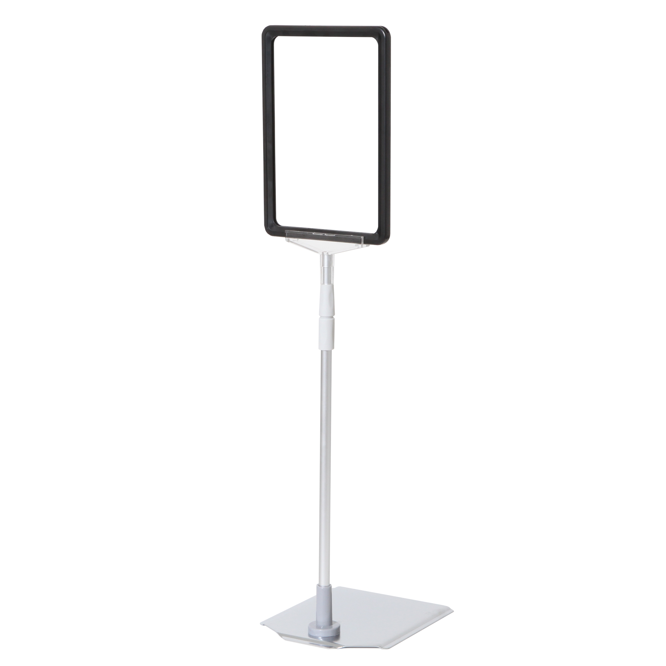 Skiltholder av topp kvalitet med en flott, tung og stabil metallfot med krom overflate, justerbar sølveloksert aluminium teleskopstang (32 til 62 cm) og svart ABS-plastramme i A5-størrelse.
