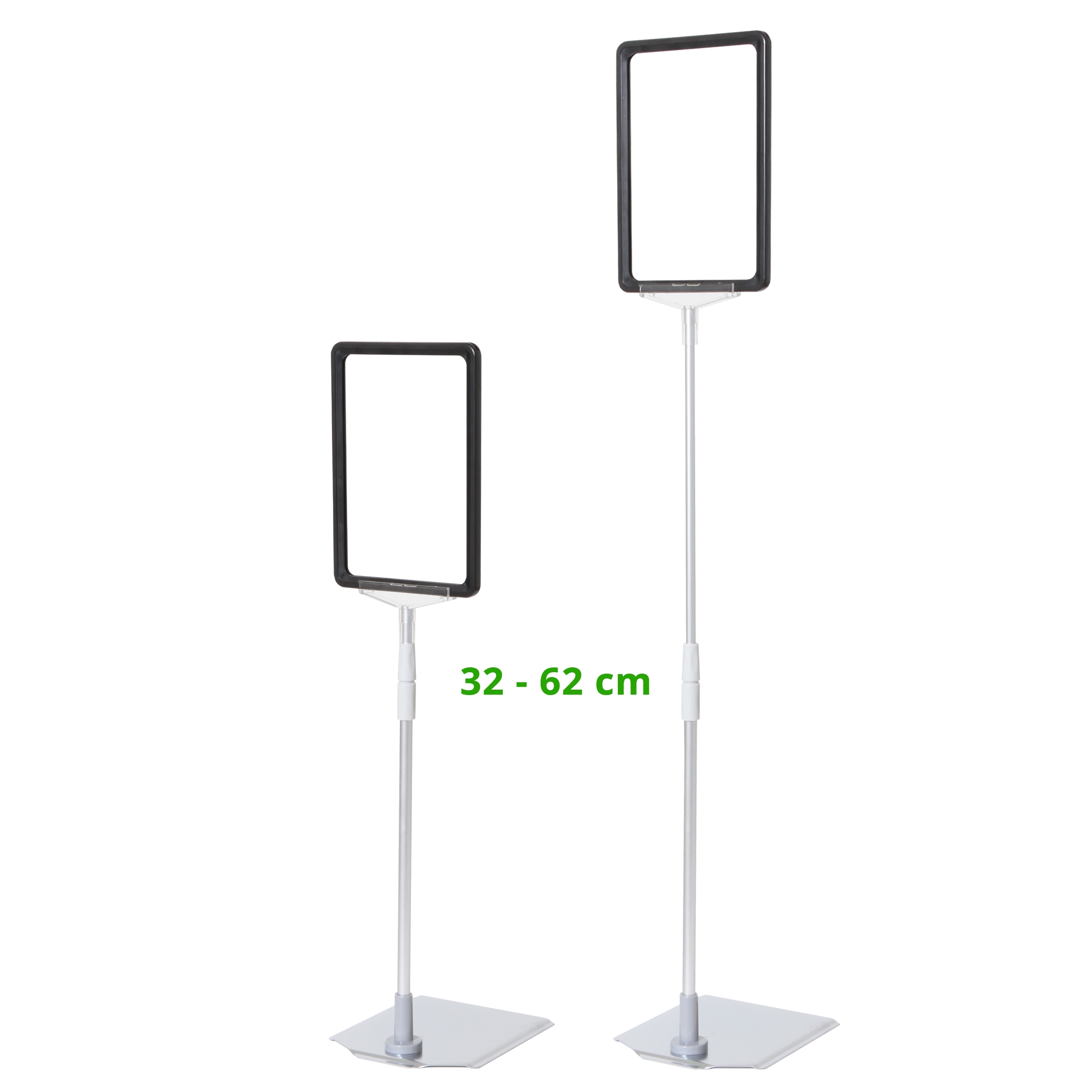 Skiltholderen er utstyrt med en teleskopstang som kan justeres fra 32 til 62 cm i høyden, samt en A5 ABS-plastramme med åpning på toppen (stående format).