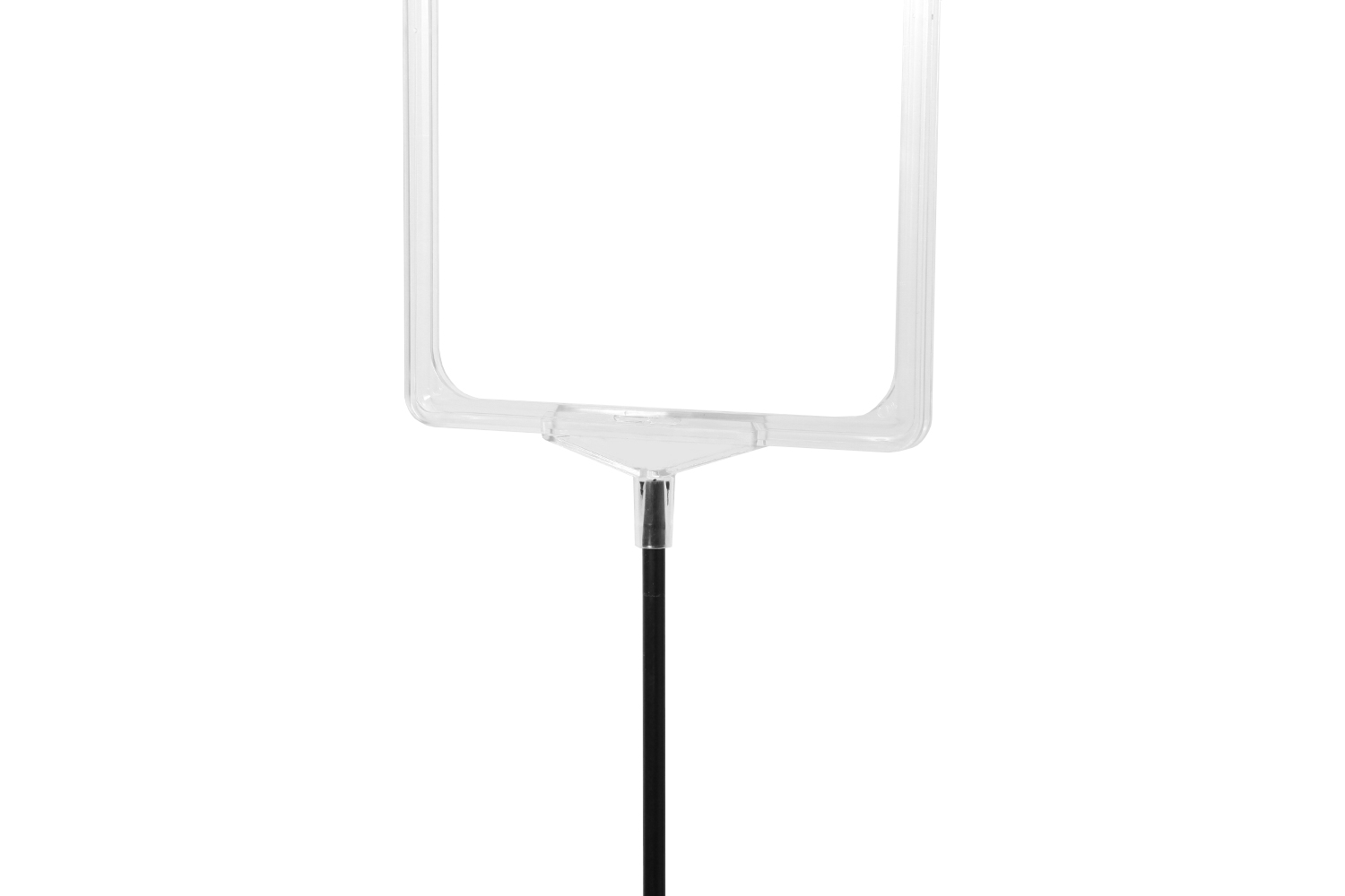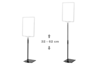 Skiltholderen er utstyrt med svart teleskopstang, som kan justeres fra 32 til 62 cm i høyden, samt plastramme med åpning i toppen (høyt format).