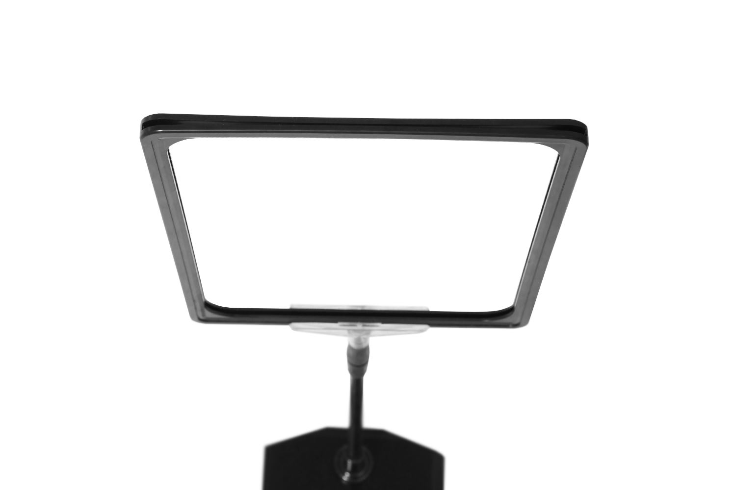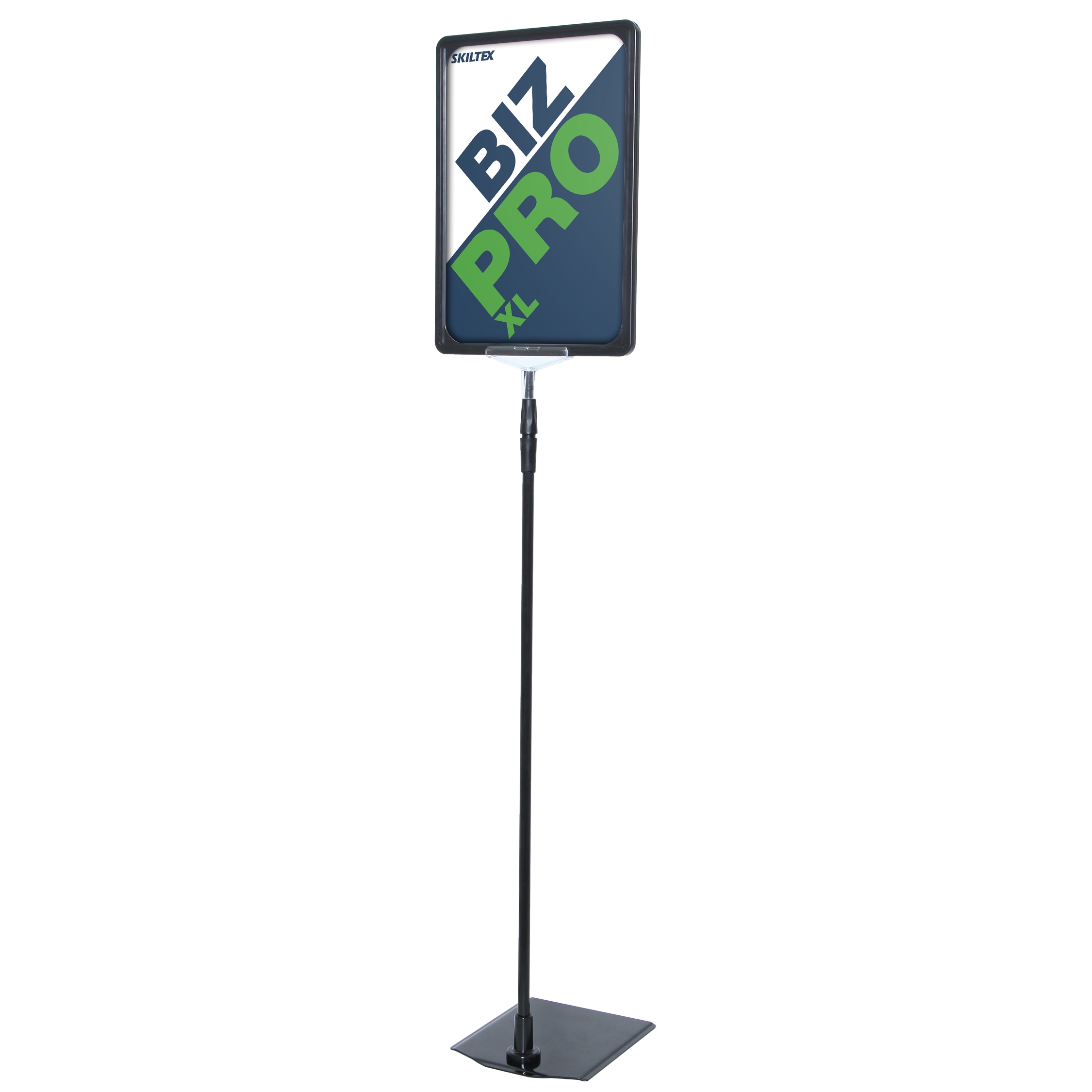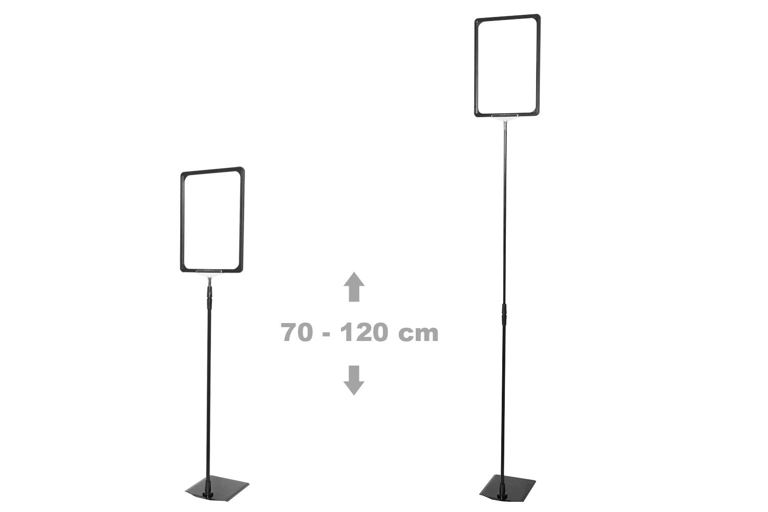 Skiltholderen er utstyrt med svart teleskopstang, som kan justeres fra 70 til 120 cm i høyden, samt plastramme med åpning i toppen (høyt format).