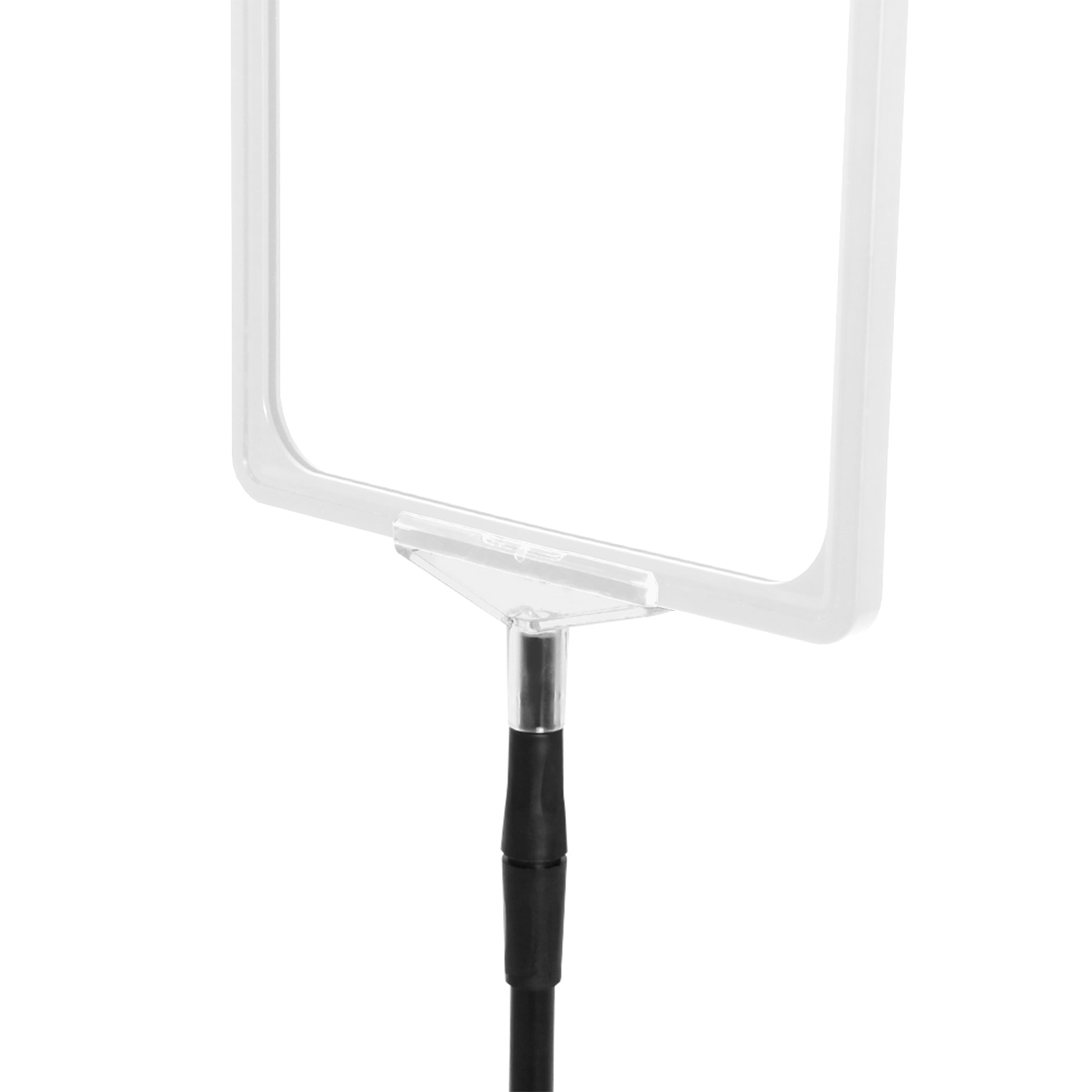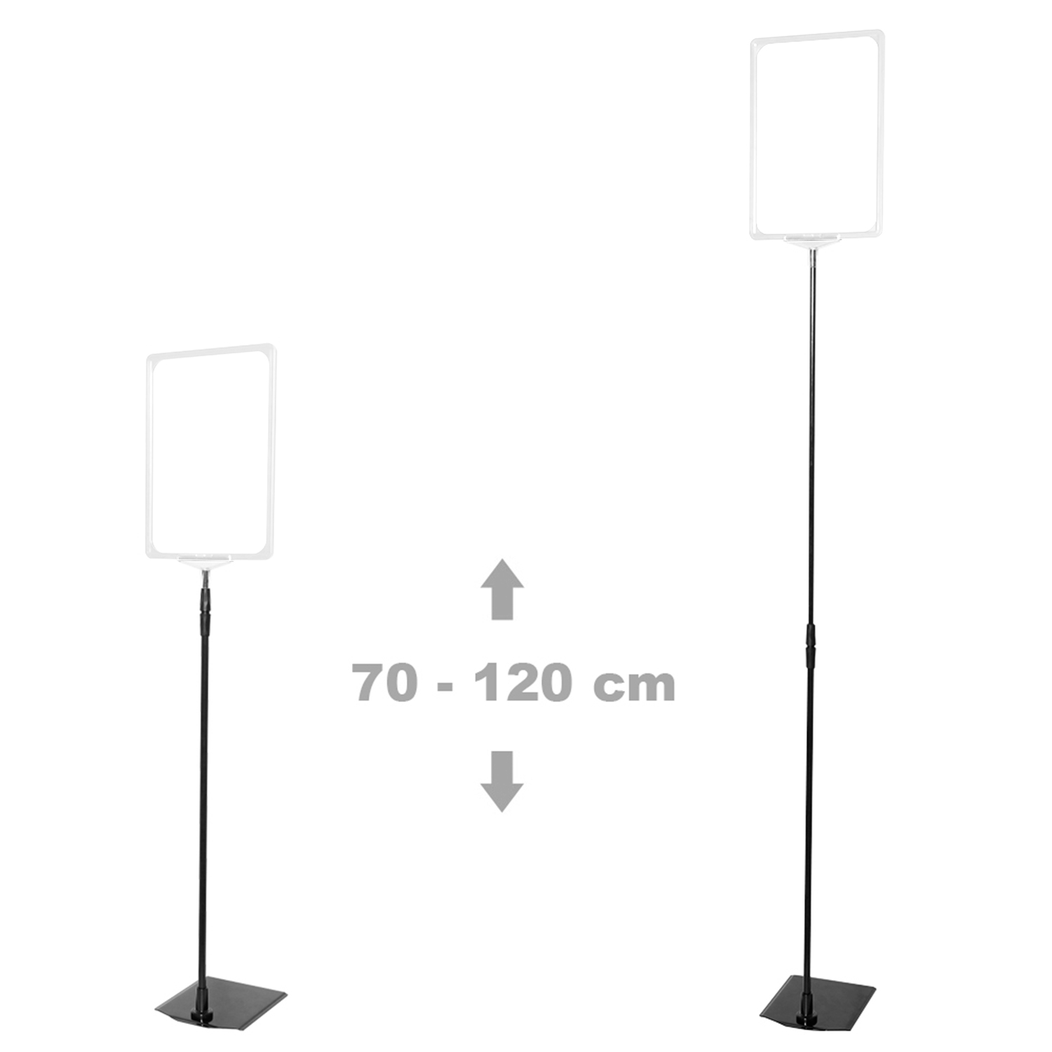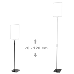 Skiltholderen er utstyrt med svart XL teleskopstang, som kan justeres fra 70 til 120 cm i høyden, samt hvit plastramme med åpning i toppen (høyt format).