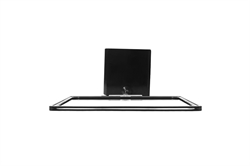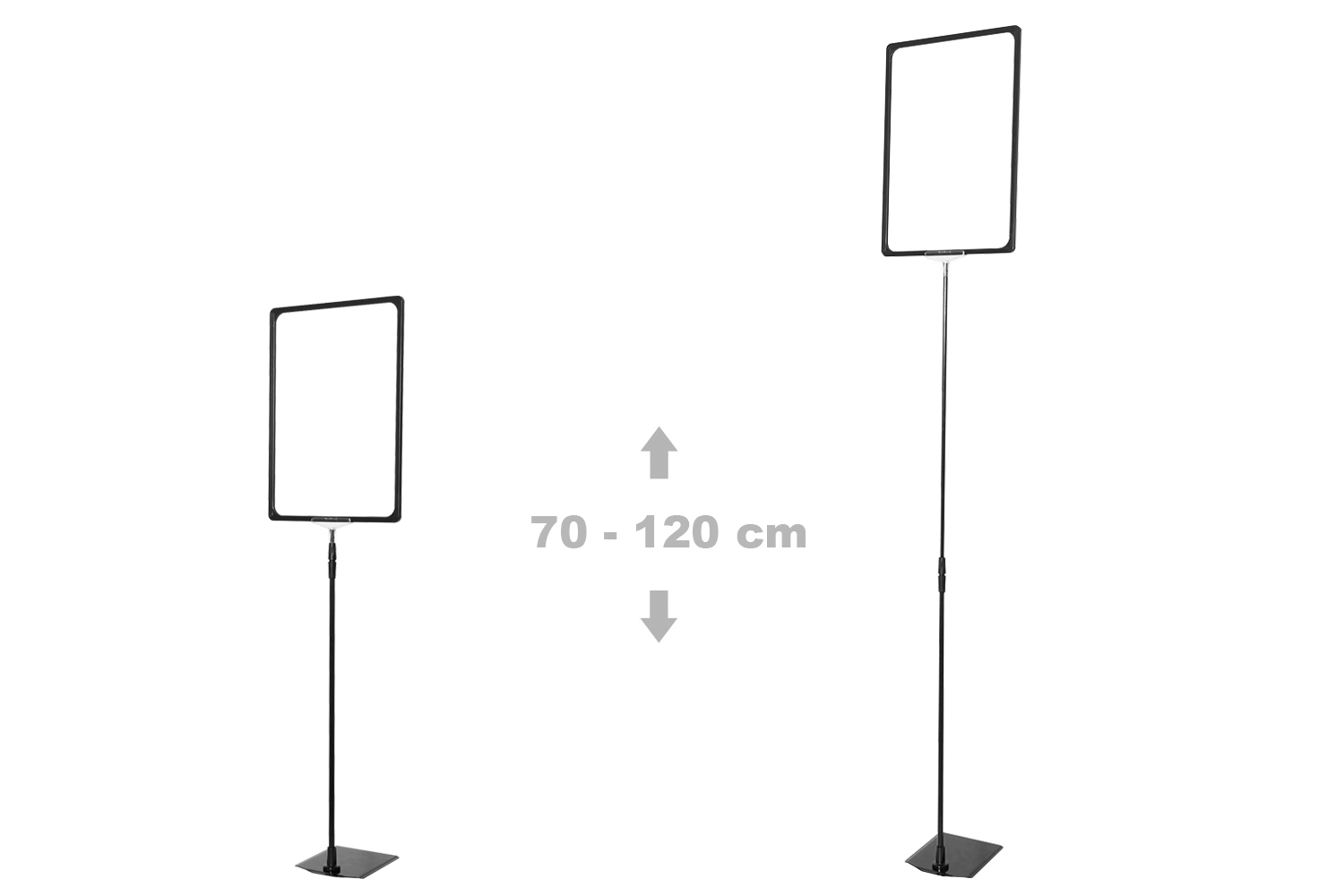 Skilteholderen er udstyret med en sort XL teleskopstang, som kan justeres fra 70 til 120 cm i højden, samt en A4 plast ramme med åbning i top (højformat).