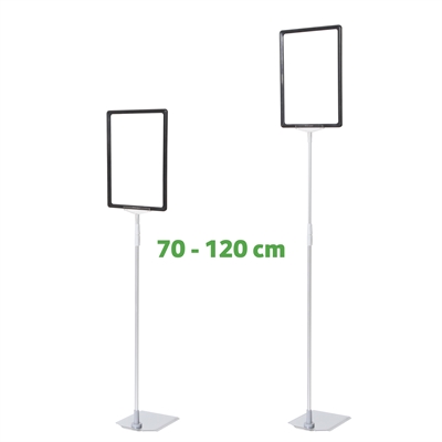 Skiltholder av topp kvalitet med en flott, tung og stabil metallfot med krom overflate, justerbar sølveloksert aluminium XL teleskopstang (70 til 120 cm) og svart A4 ramme i ABS-plast.