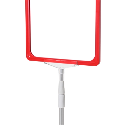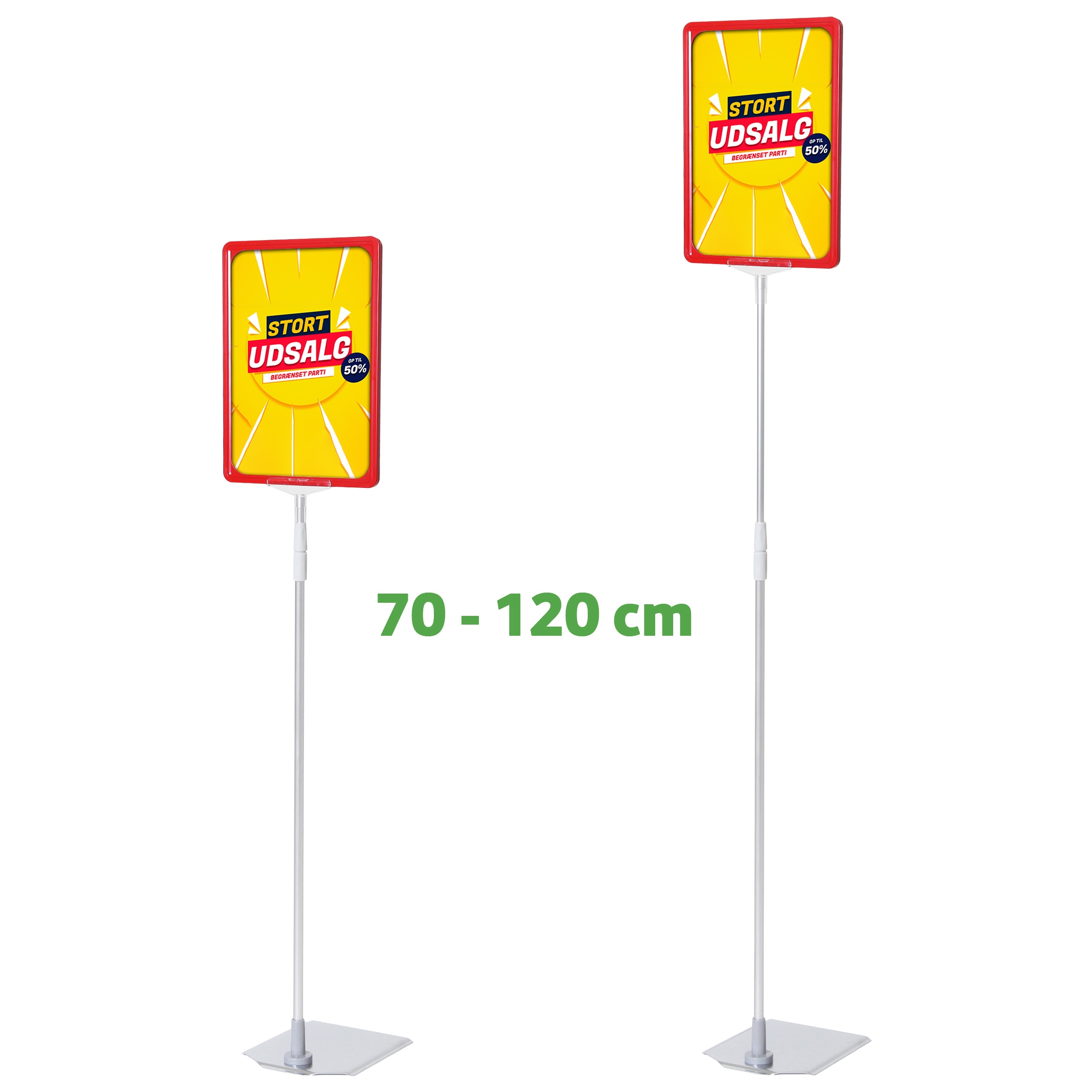 Skiltholder av topp kvalitet med en flott, tung og stabil metallfot med krom overflate, justerbar sølveloksert aluminium XL teleskopstang (70 til 120 cm) og rød A4 ramme i ABS-plast.