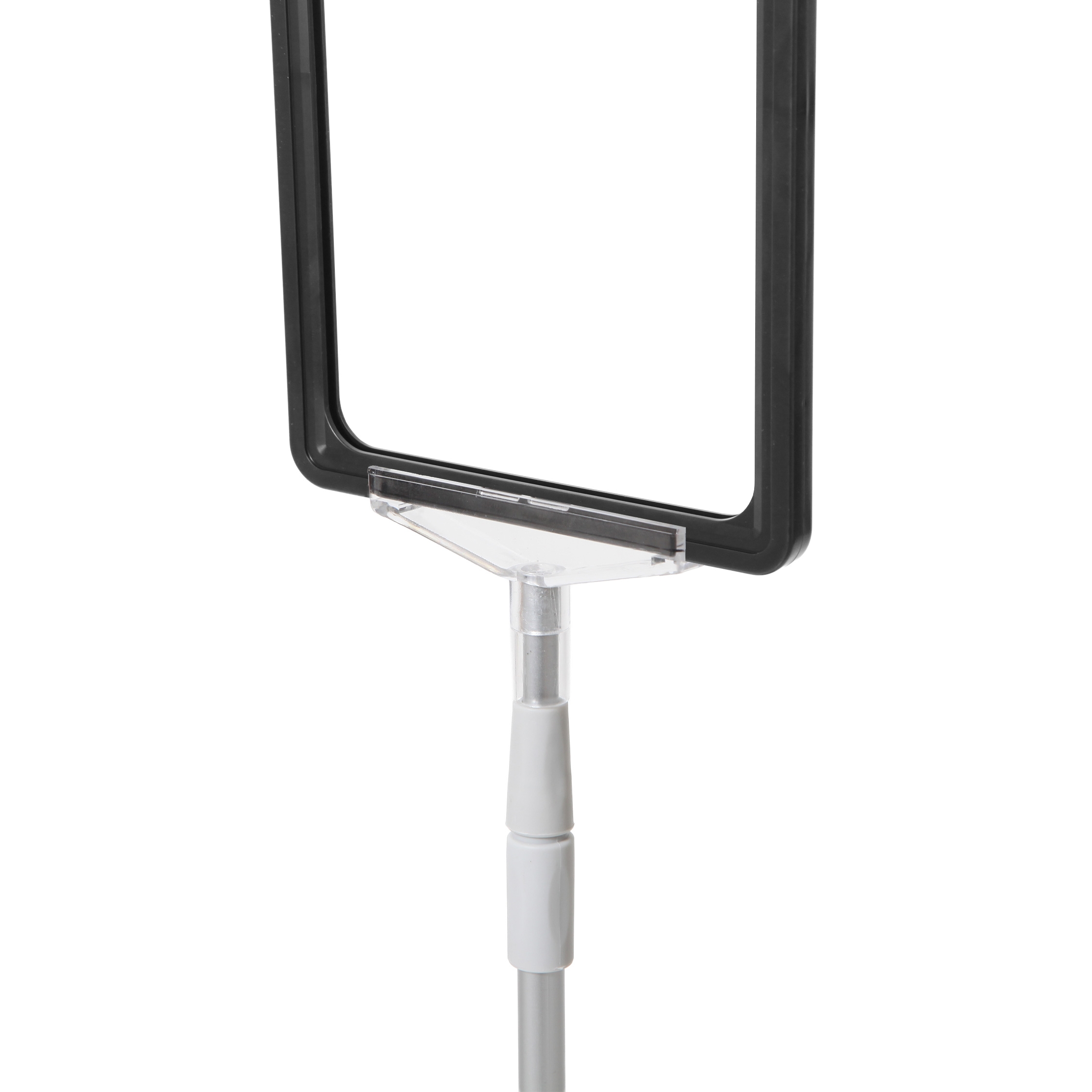 Skiltholder av topp kvalitet med en flott, tung og stabil metallfot med krom overflate, justerbar sølveloksert aluminium XL teleskopstang (70 til 120 cm) og svart A5 ramme i ABS-plast.