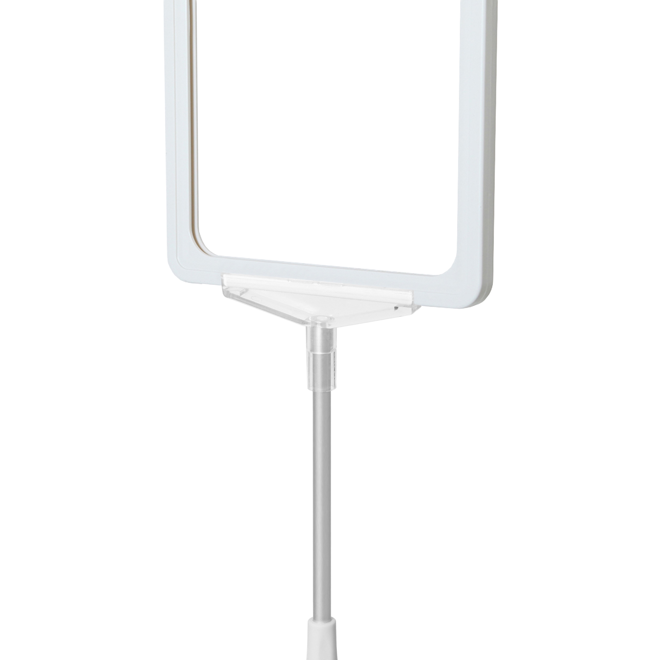 Skiltholder av topp kvalitet med en flott, tung og stabil metallfot med krom overflate, justerbar sølveloksert aluminium XL teleskopstang (70 til 120 cm) og hvit A5 ramme i ABS-plast.