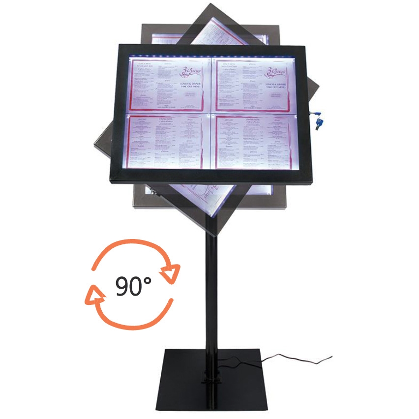 Menustativet er utstyrt med energieffektive hvite LED lys i kantene der de belyser opp til 4 x A4 sider og leveres med fjernkontroll.