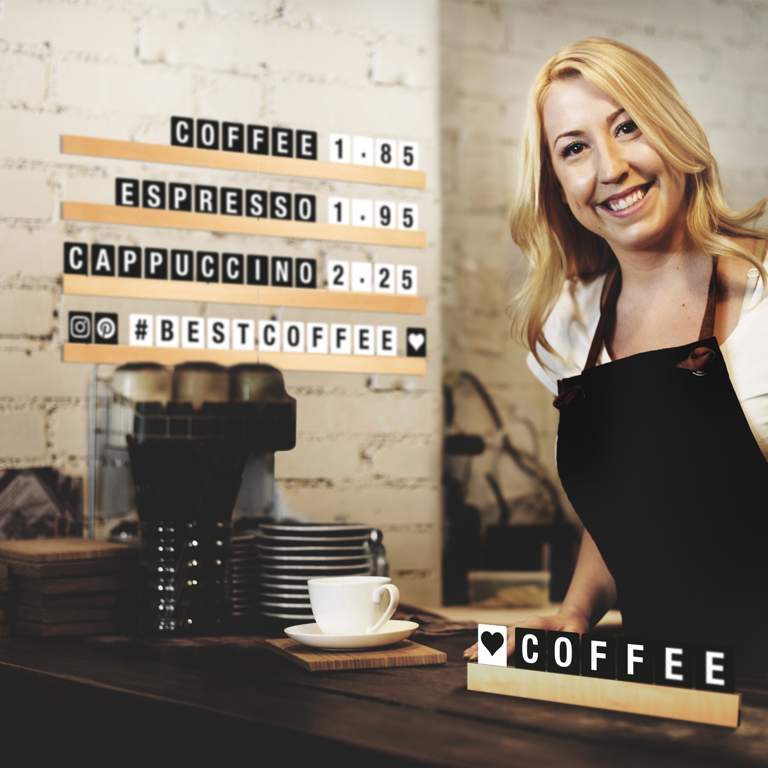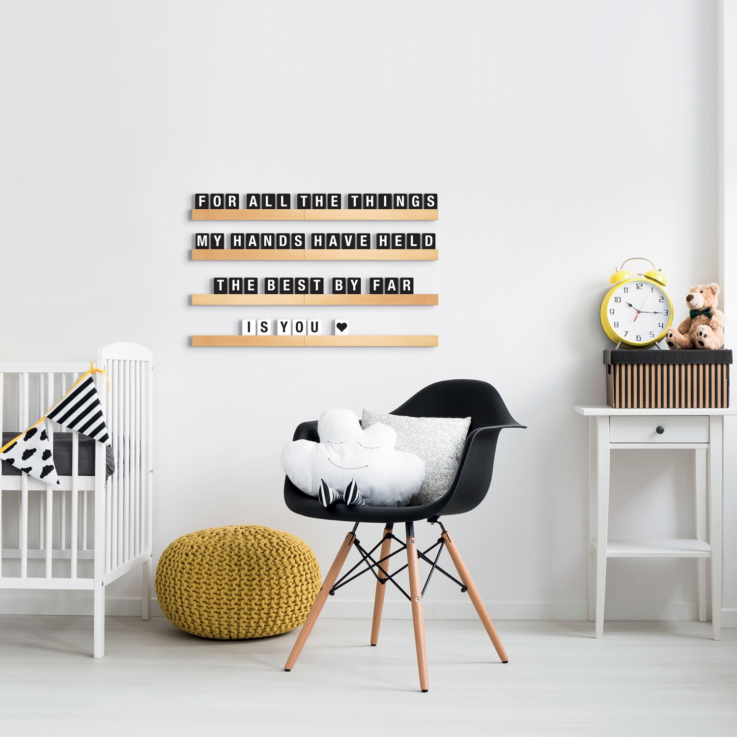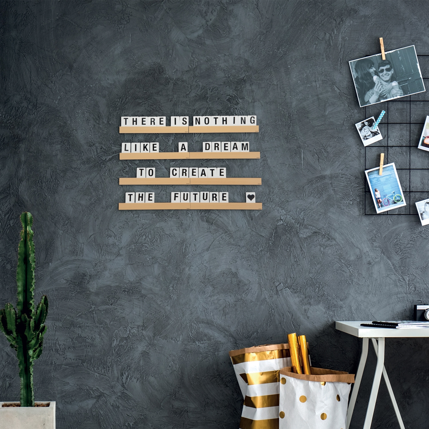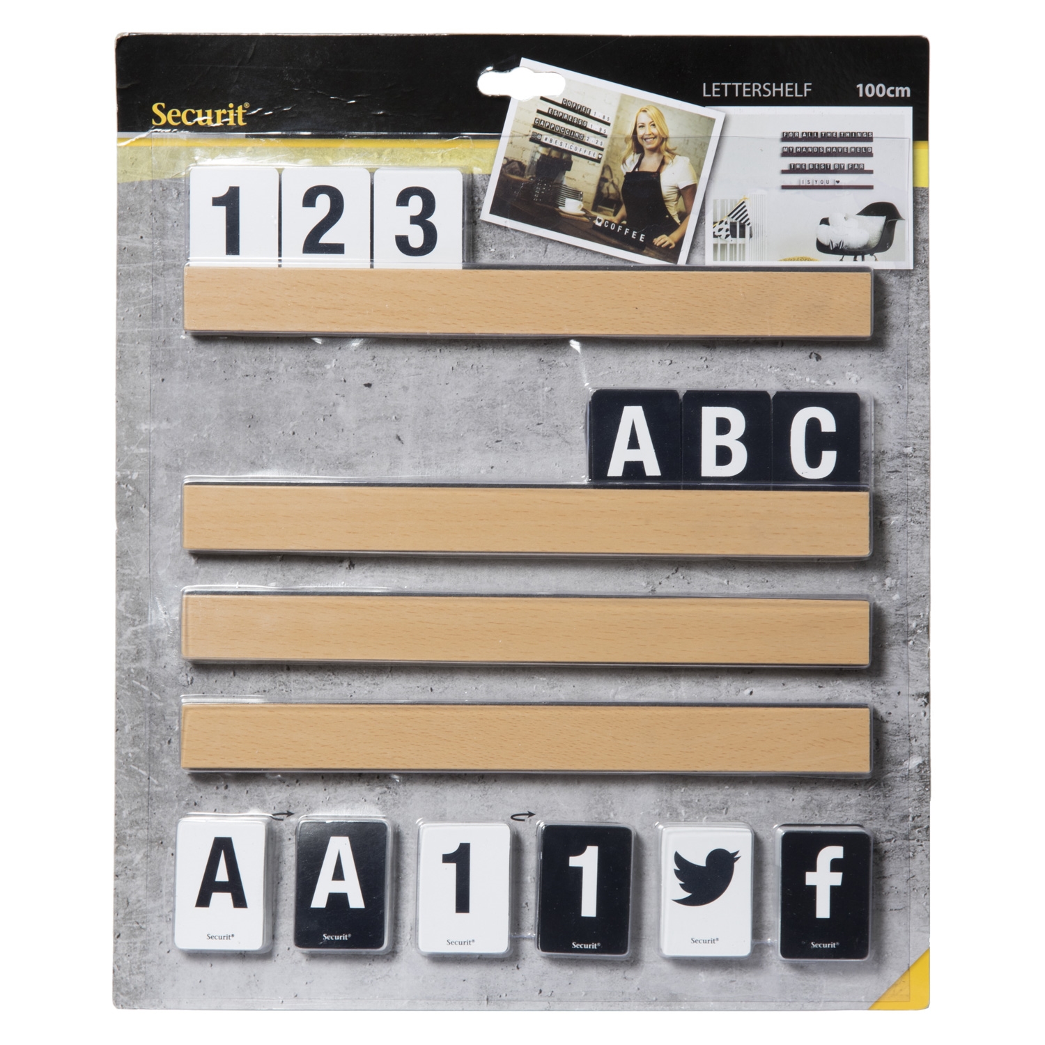 Bokstavshyller i lyst teaktre. Med sin stilrene og allsidige design, passer disse bokstavshyller inn i både det private og det offentlige. Brukes til at vise generell informasjon, priser og beskjeder på en sjarmerende og diskret måte! De 4 Hyllene er hver 25 brede og kommer med 169 dobbelsidig skilter av tall, bokstaver og symboler i både svart og hvit. Monteres på veggen via de selvklebende plater som følger med. Bokstavshyllene kan settes opp på de fleste steder som Kaffebarer, Skoler, Caféer, Biblioteker og hjemme i det private.