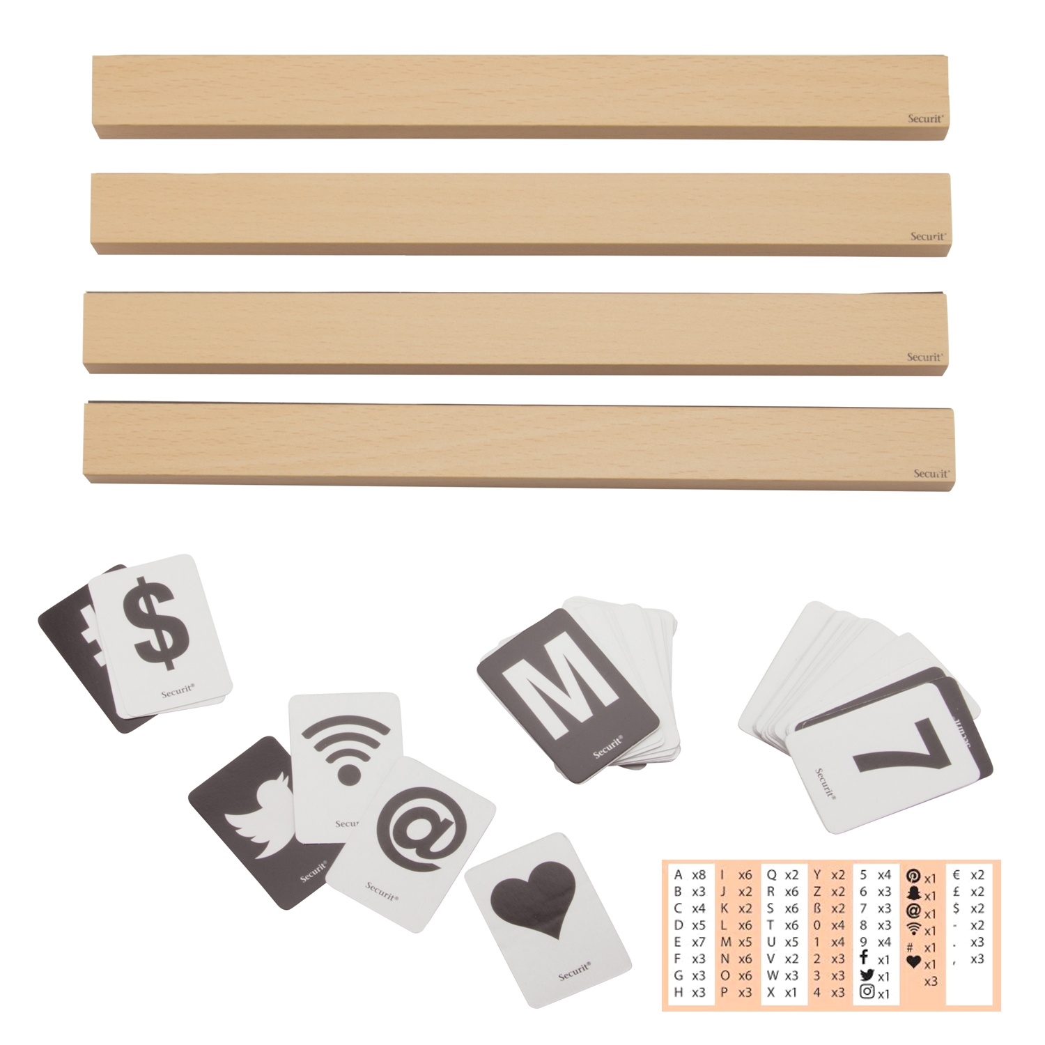169 dobbelsidig svarte og hvite skilter med bokstaver, tall og symboler.